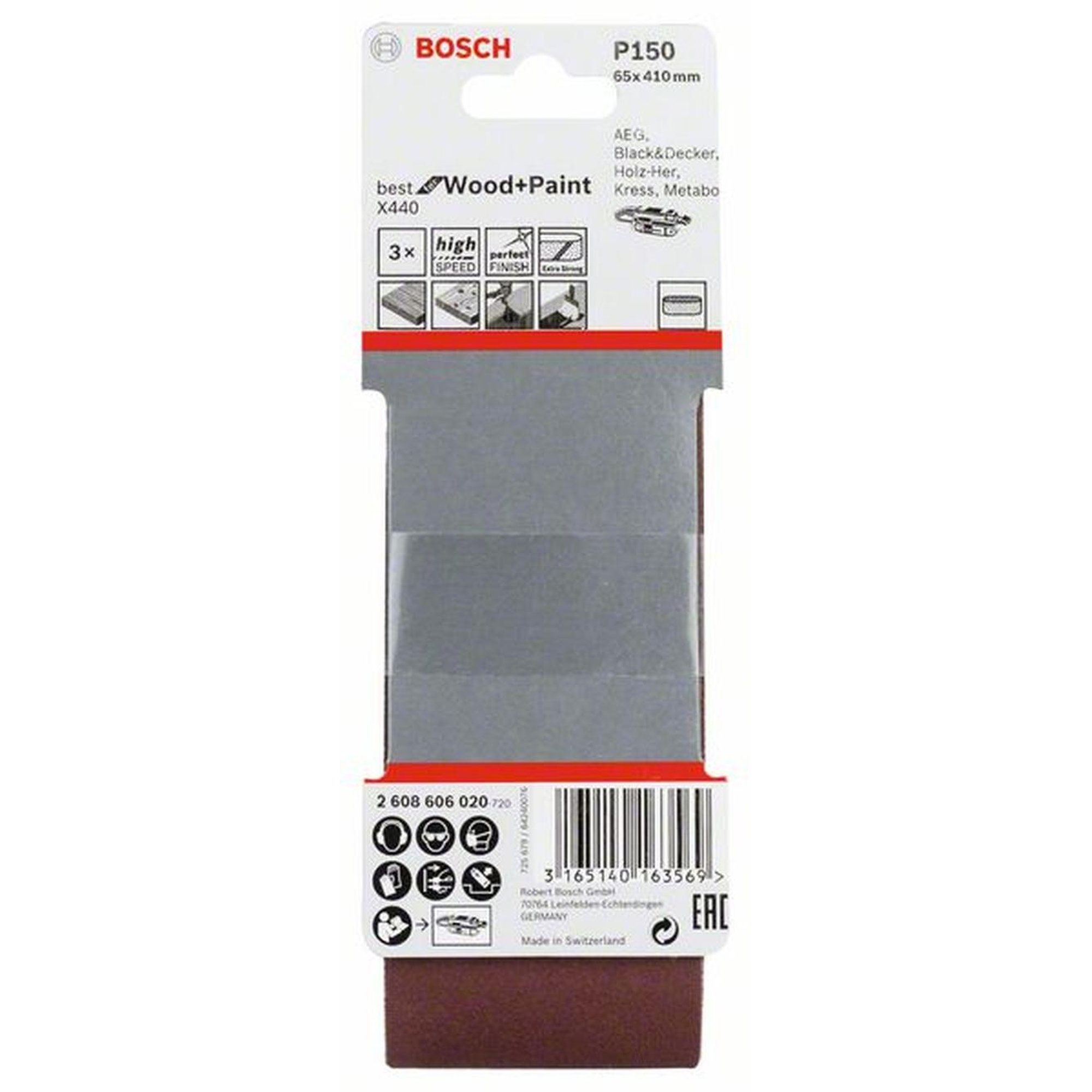 Das BOSCH Schleifband X440 Best for Wood and Paint ist die ideale Wahl für alle, die Holz und Farbe schleifen möchten. Mit einer Bandabmessung von 65 mm Breite und 410 mm Länge bietet es eine optimale Größe für den Einsatz in Bandschleifern. Die Körnung von 150 sorgt für ein feines Schleifergebnis und ermöglicht eine glatte Oberfläche.