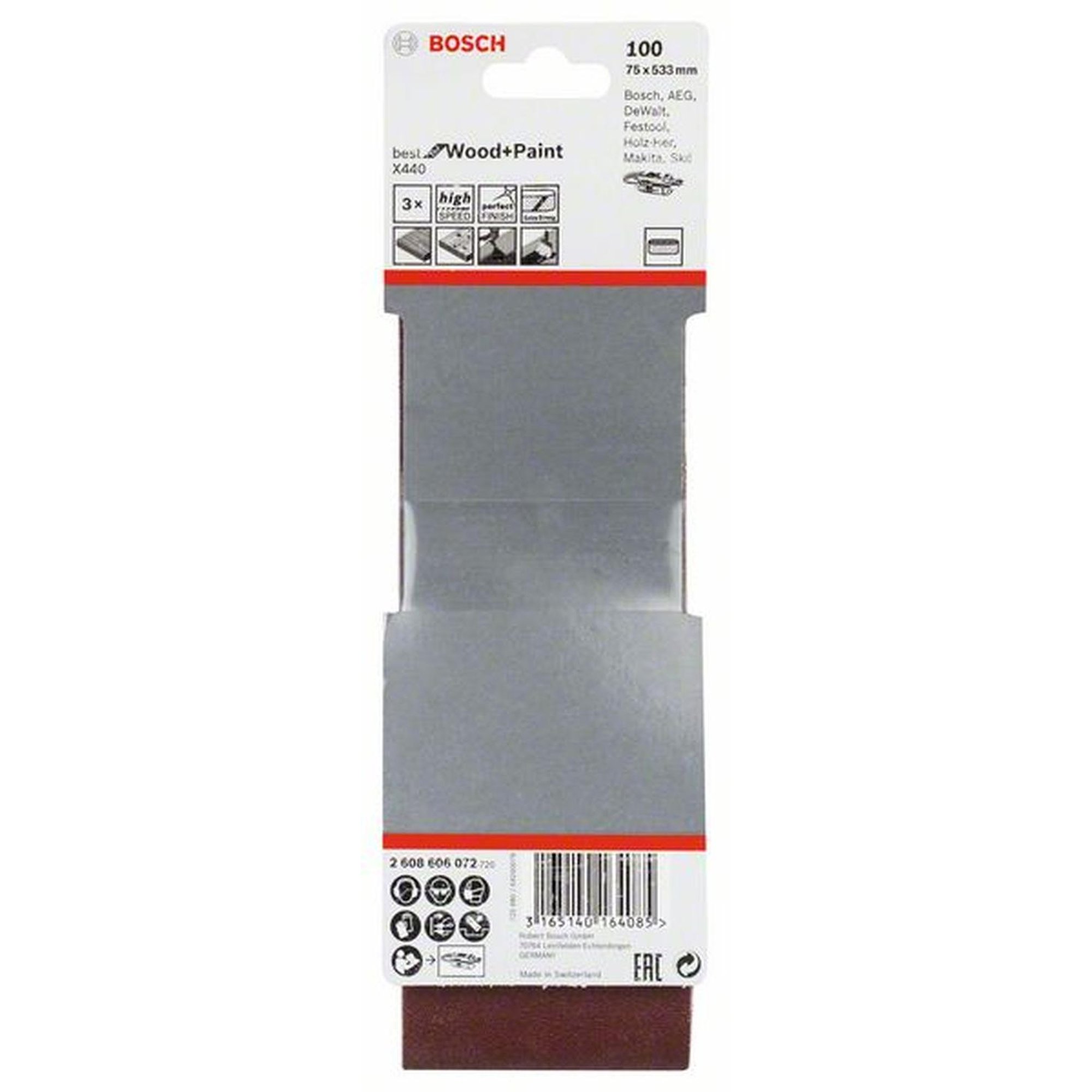 Merkmale: Das BOSCH Schleifband X440 Best for Wood and Paint ist ein hochwertiges und speziell für Bandschleifer entwickeltes Produkt. Mit einer Breite von 75 mm und einer Länge von 533 mm bietet es optimale Maße für unterschiedliche Schleifarbeiten