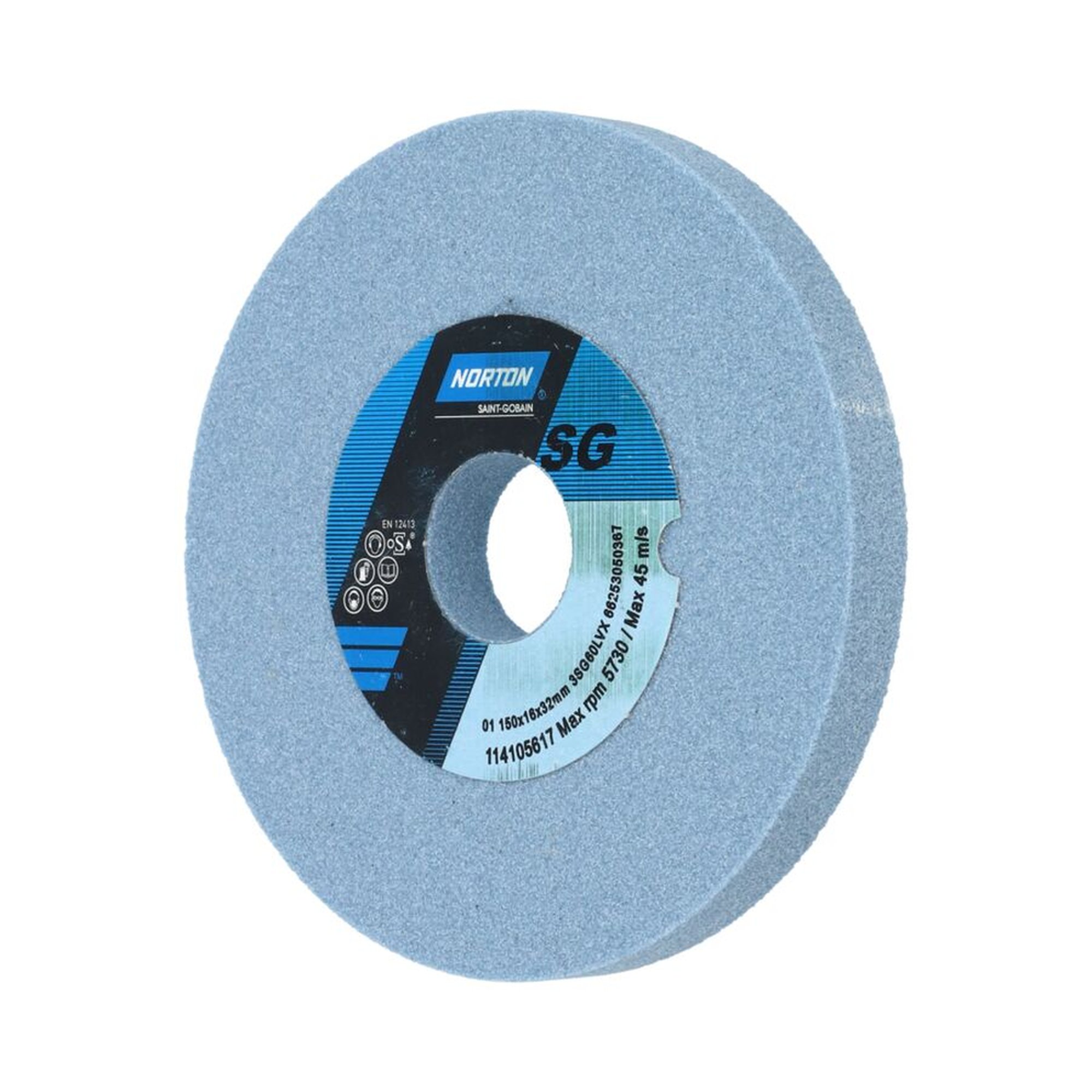 Keramisch gebundene Schleifscheibe von Norton, ideal für präzises Schleifen und Schärfen von Werkzeugen und Fräsern. Maße: 150x16x32mm, Körnung 60. Ideal für stationäre Maschinen.,