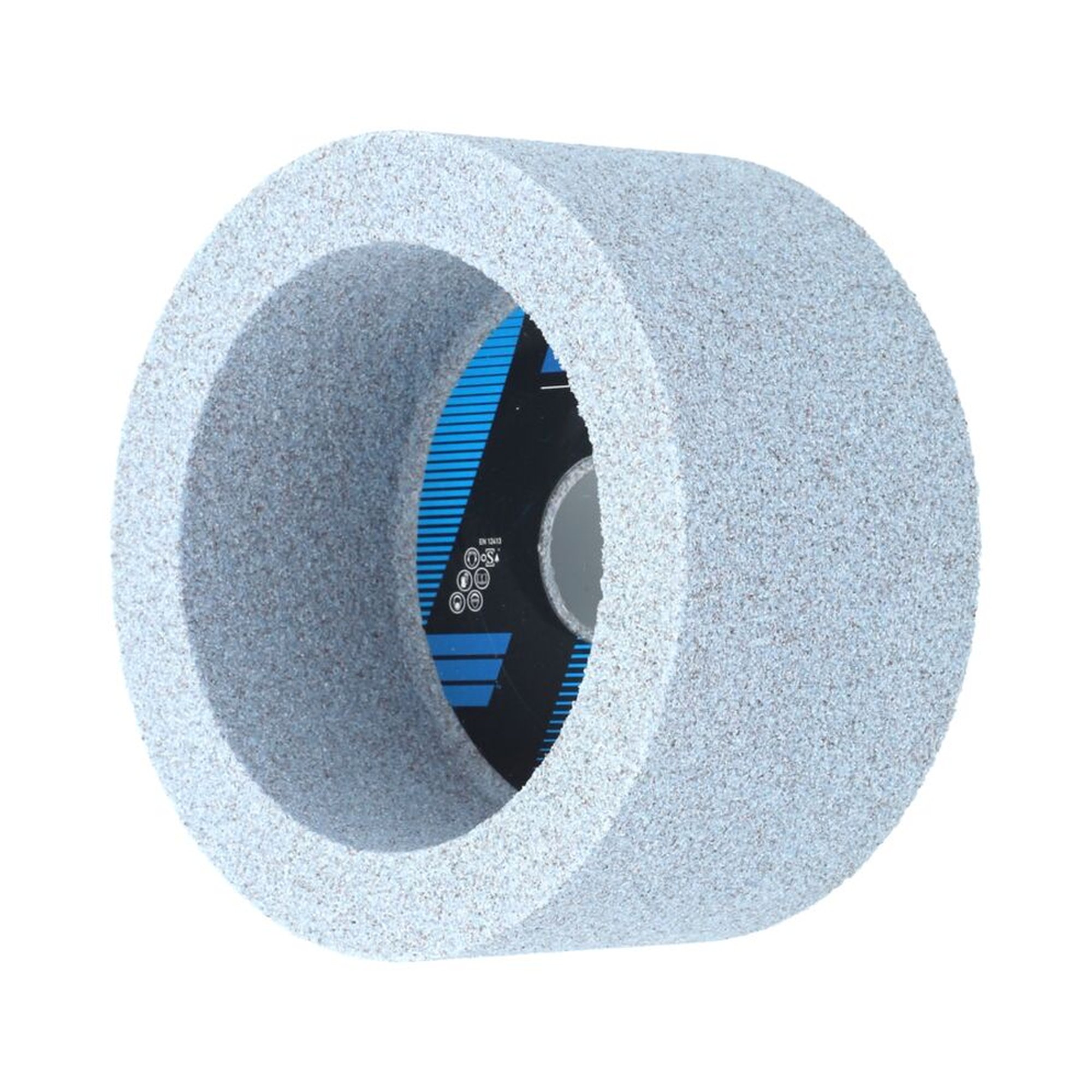 Die Schleifscheibe ist mit einer keramisch gebundenen Struktur ausgestattet, die eine erhöhte Haltbarkeit und Leistung gewährleistet. Sie enthält einen geringen Anteil an Keramikkorn, was die Schneideigenschaften verbessert und sie härter sowie schärfer als herkömmliche Schleifscheiben macht. Diese Eigenschaften machen den Schleiftopf ideal für das Bearbeiten einer Vielzahl von Stählen.