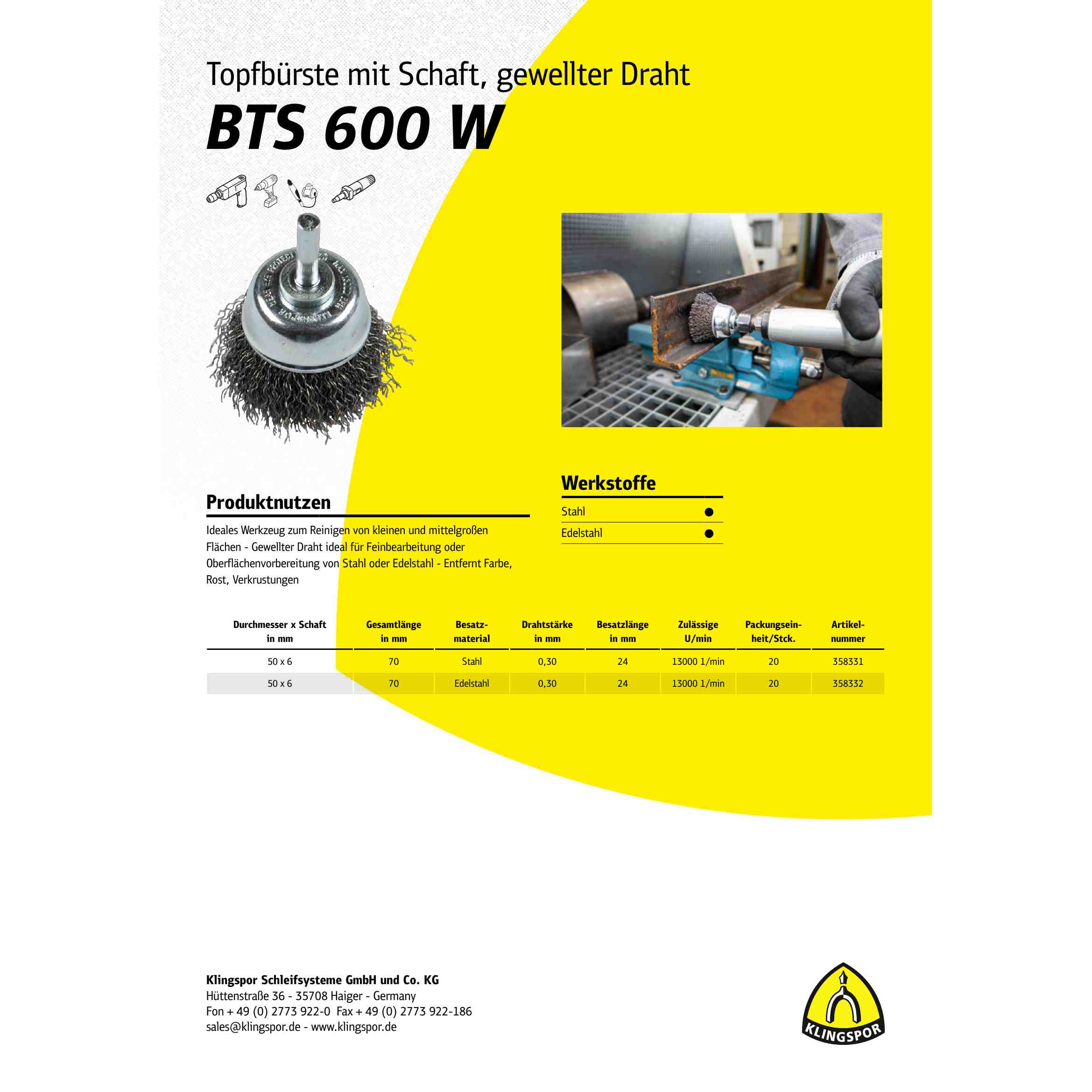 20 x Klingspor Topfbürste mit Schaft, 50 x 6 mm, 0,3 Edelstahl
