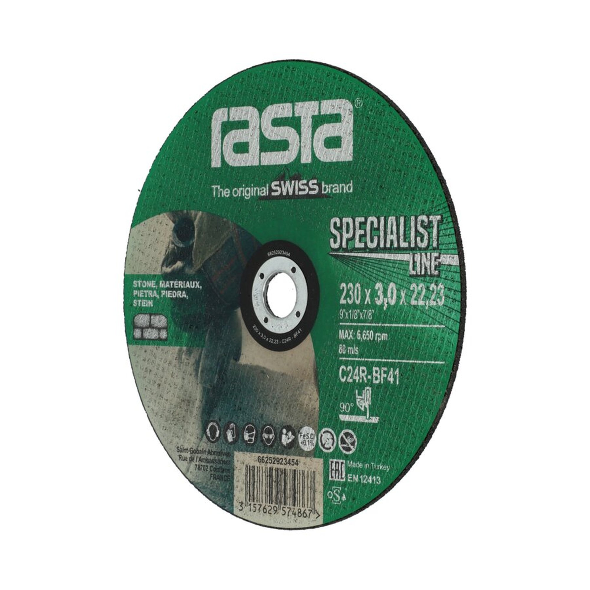 Die Rasta SPECIALIST LINE Trennscheibe ist speziell für den Einsatz auf Stein und Mauerwerk konzipiert. Mit einer Abmessung von 230x3x22.23mm und der spezifischen Kennzeichnung C24R RASTA, eignet sich dieses hochwertige Werkzeug hervorragend für professionelle Anwendungen im Baugewerbe sowie im Produktionsverbindungshandel (PVH).