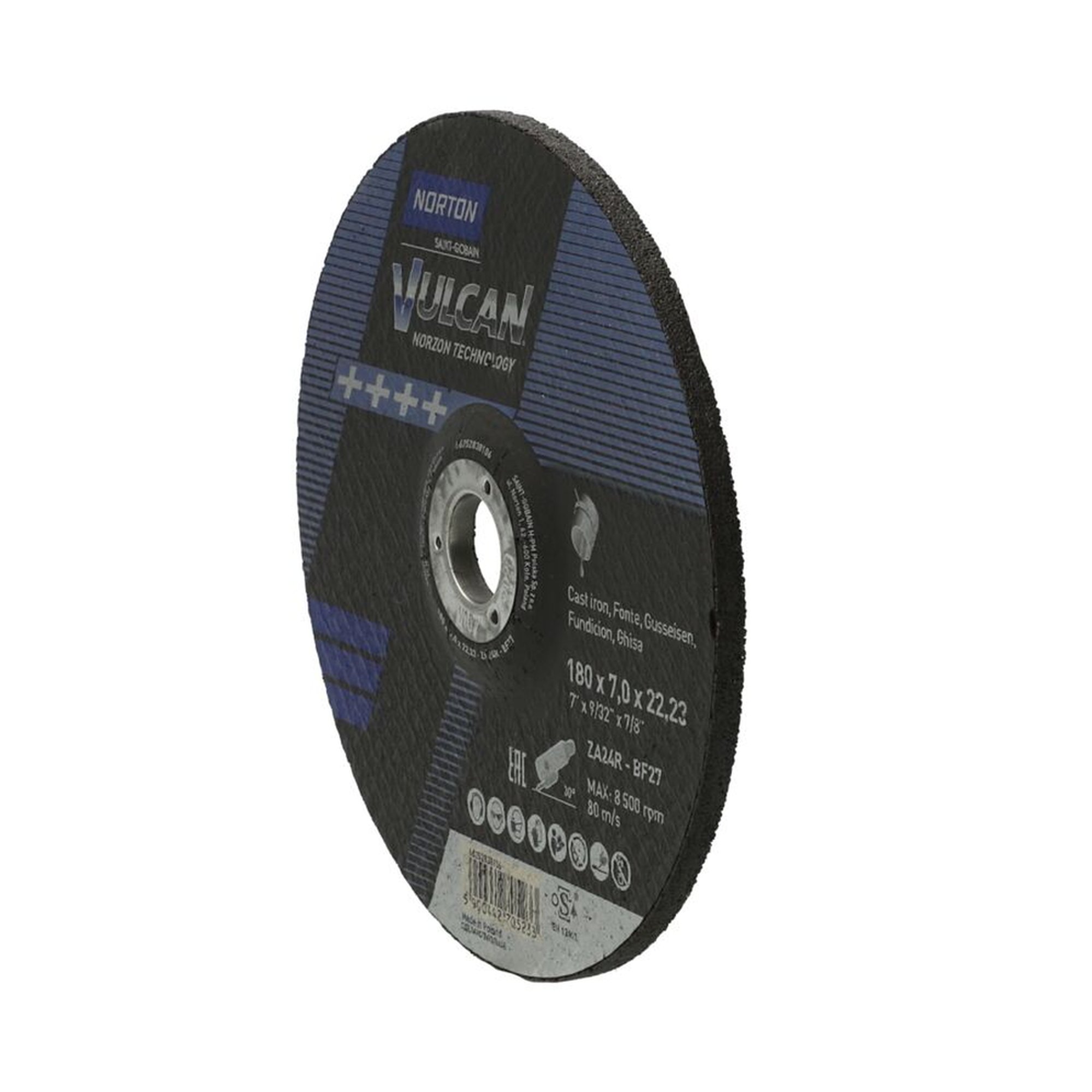 Die Norton Vulcan Schruppscheibe zeichnet sich durch ihre hochwertige Verarbeitung und die spezielle Materialkombination aus. Mit einer Größe von 180x7x22.23mm ist diese Scheibe optimal für den Einsatz auf Winkelschleifern geeignet. Sie eignet sich besonders für die Bearbeitung von Metall, insbesondere Gusseisen und Stahl.