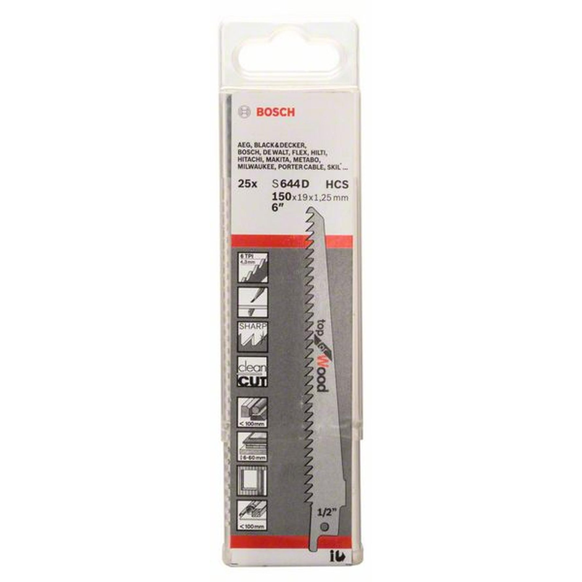 Die Säbelsägeblätter S 644 D sind kompatibel mit Säbelsägen, die über 0,5-Zoll-Universalschaftsysteme verfügen. Die Zahnausführung ist geschränkt und geschliffen, mit einer Zahnteilung von 4,3 mm / 6 TPI. Das Blattmaterial besteht aus HighCarbonSteel (HCS) und der Körper ist ebenfalls aus HCS gefertigt.