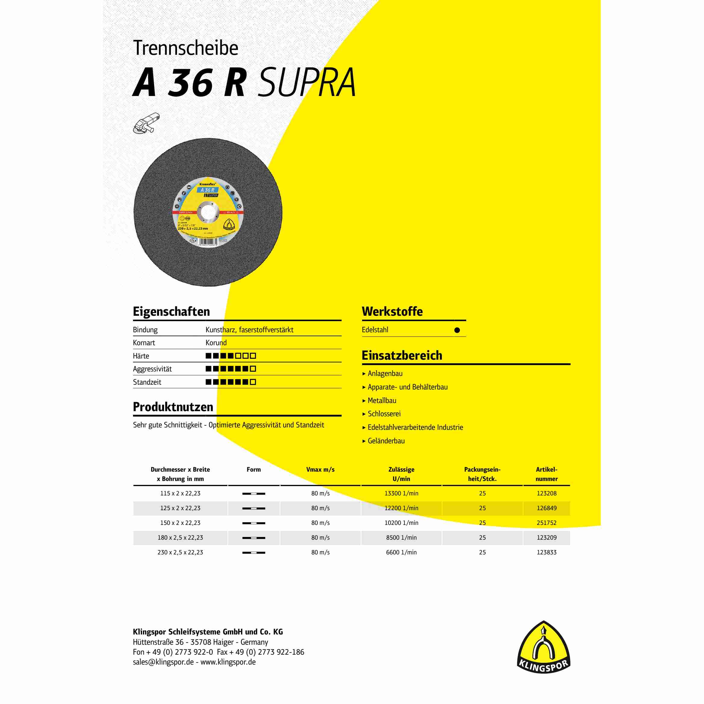 25 x Klingspor A 36 R Trennscheiben, 125 x 2 x 22,23 mm gerade