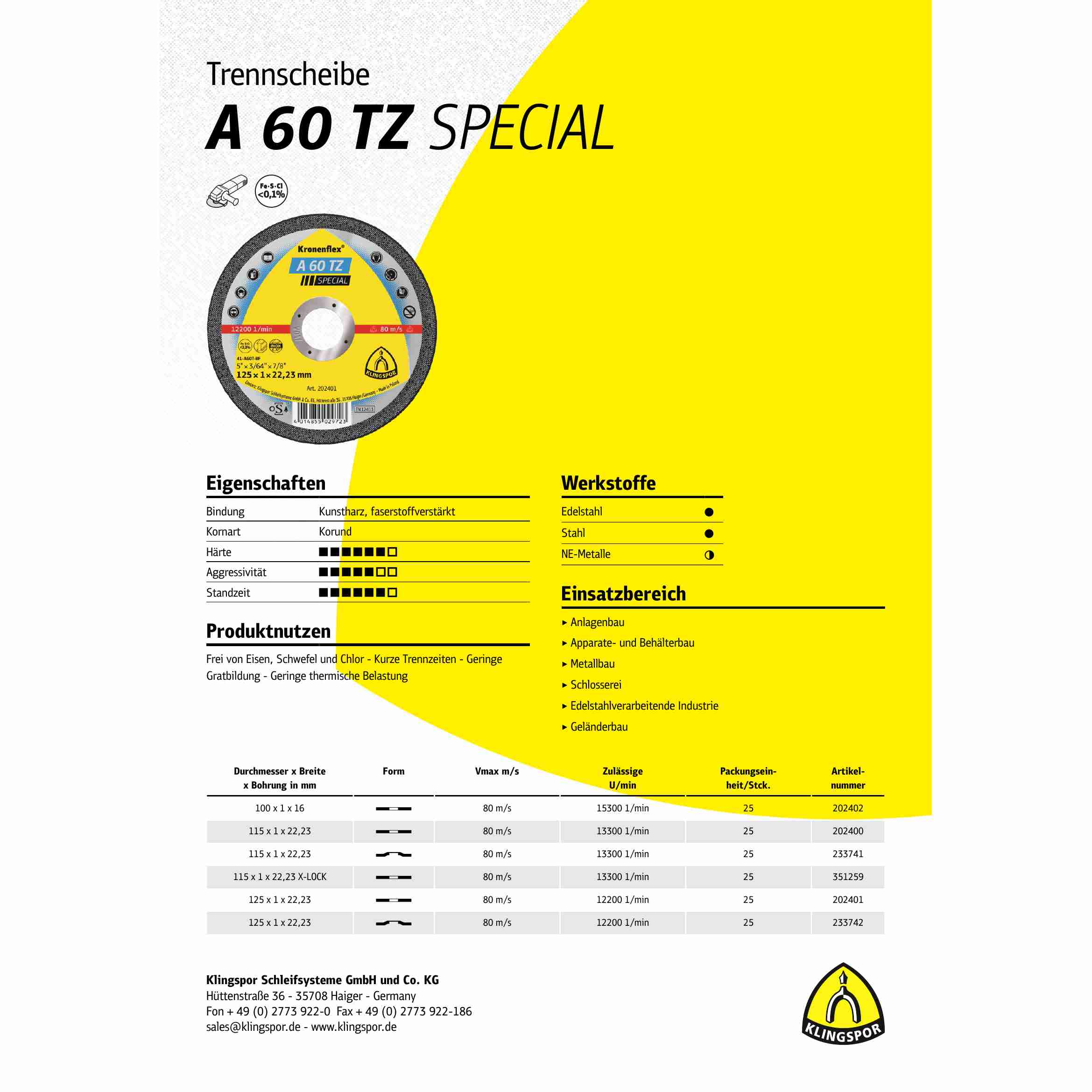Eigenschaften: Extra dünne Hochleistungstrennscheibe für präzise Schnitte bei Flacheisen, Blechen, dünnwandigen Profilen und Rohren. Die A60 TZ Special schneidet gratarm und schnell. Hergestellt aus hochwertigen Materialien mit FE/S/CL