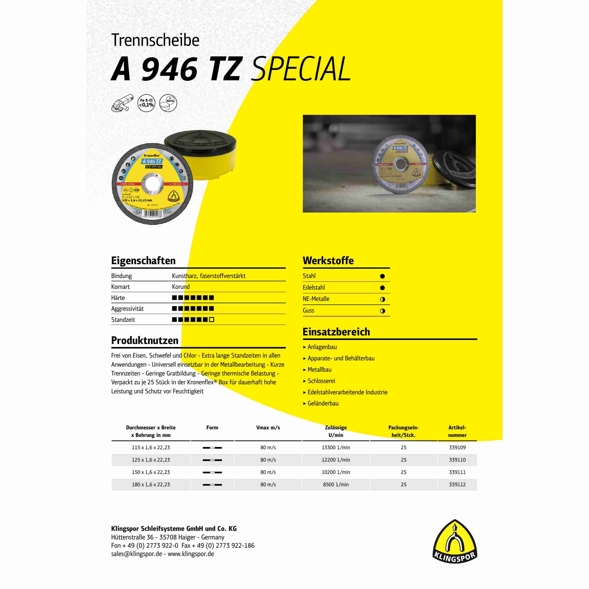 25 x Klingspor A 946 TZ Trennscheiben, 125 x 1,6 x 22,23 mm gerade