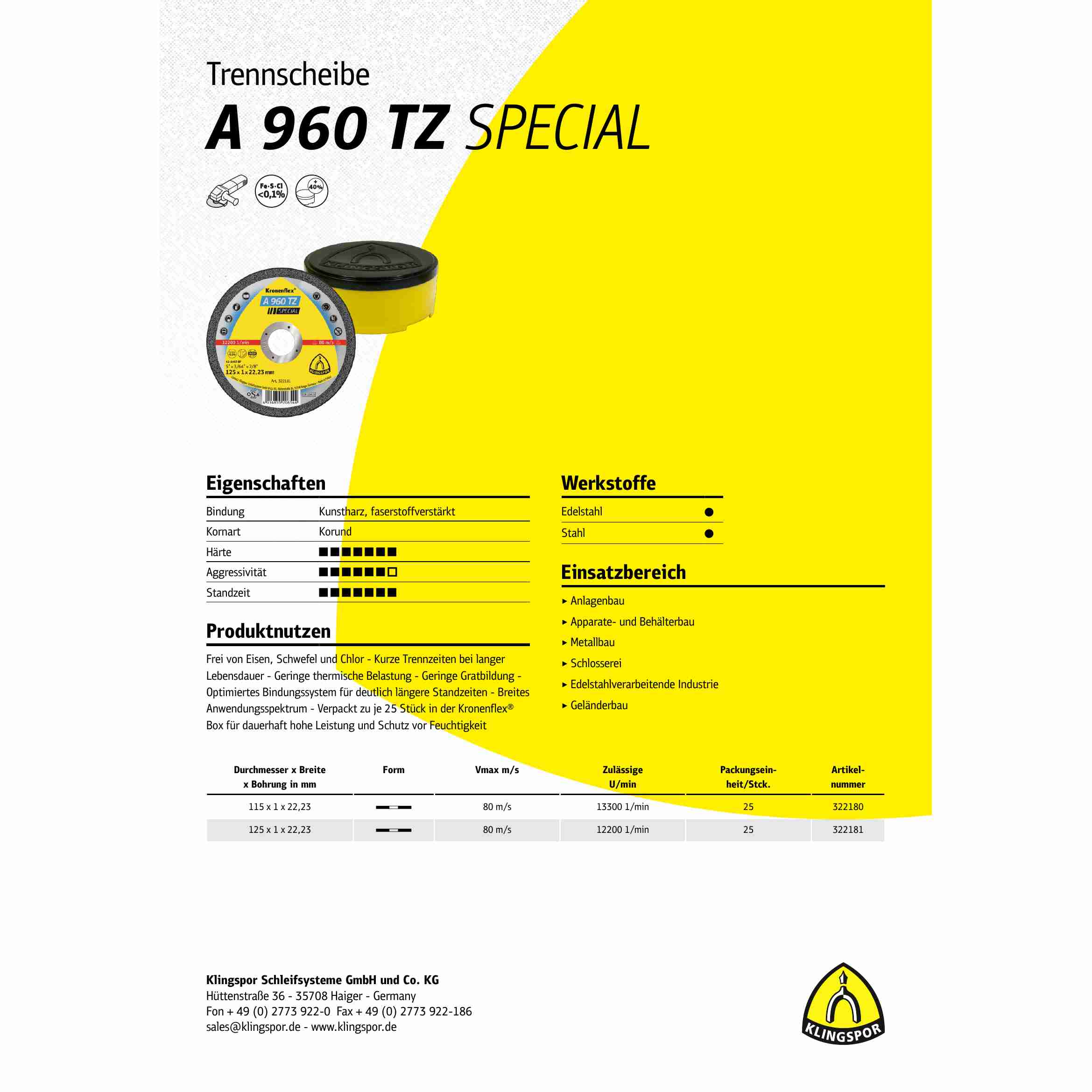Die Klingspor A 960 TZ Trennscheiben sind eine ausgezeichnete Wahl für alle, die eine zuverlässige und langlebige Trennscheibe benötigen. Mit ihrer hohen Schnittleistung und ihrer langen Standzeit sind sie ideal für den Einsatz in der Metallbearbeitung, im Maschinenbau und in vielen anderen Bereichen geeignet.