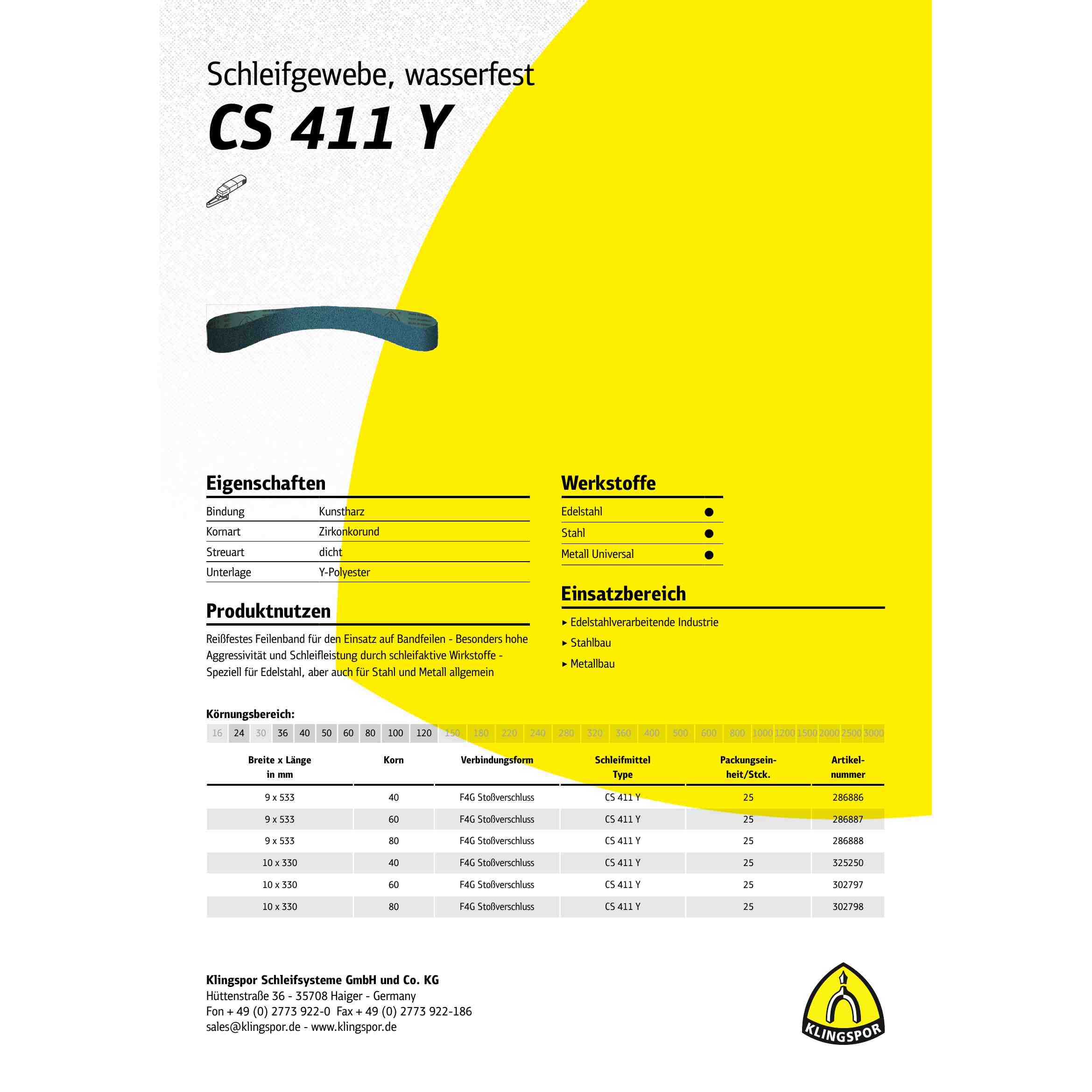 Merkmale: Das Klingspor CS 411 Y Schleifband ist ein hochwertiges Schleifmittel. Es ist besonders reißfest und ideal für den Grobschliff und das Entgraten von Stahl und Edelstahl