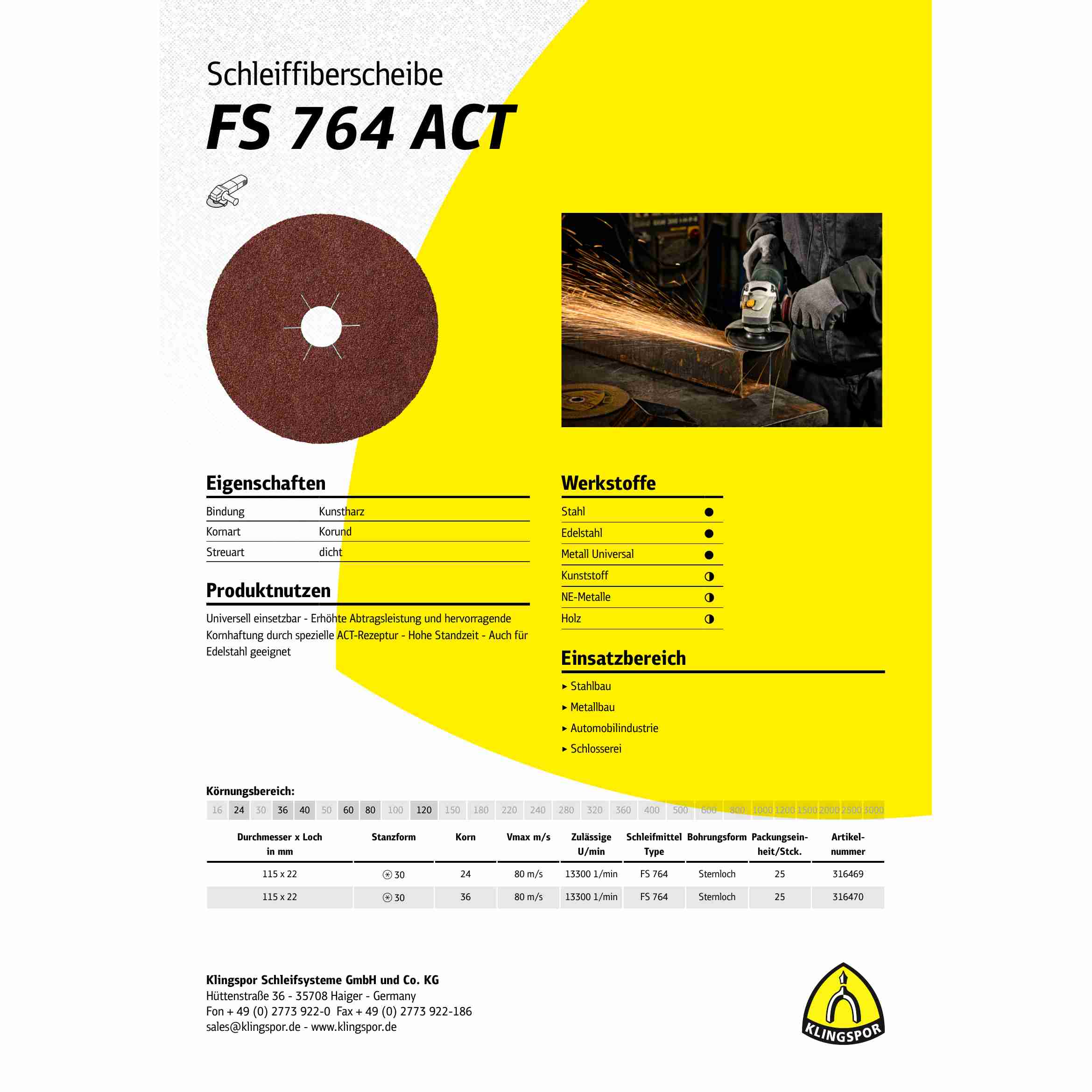 Eigenschaften: Die Klingspor FS 764 Fiberscheiben sind Schleiffiberscheiben, die speziell für die Bearbeitung von Stahl und NE-Metallen entwickelt wurden