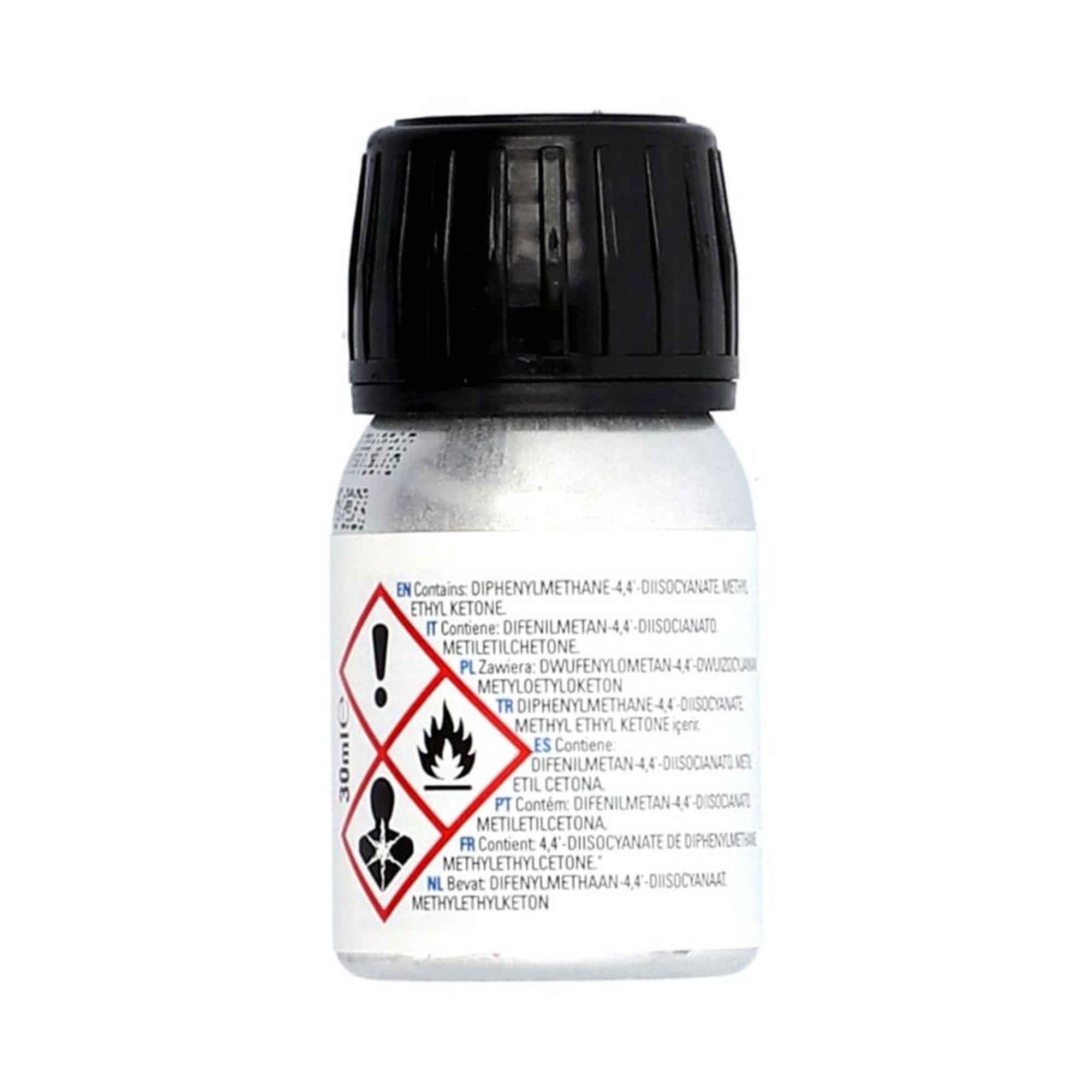 Dieser 30 ml PU Primer in einer schwarzen Metallflasche eignet sich ideal für die Vorbehandlung verschiedener Oberflächen wie Metalle, Glas und Kunststoffe, ausgenommen PE-PP und PFTE.,