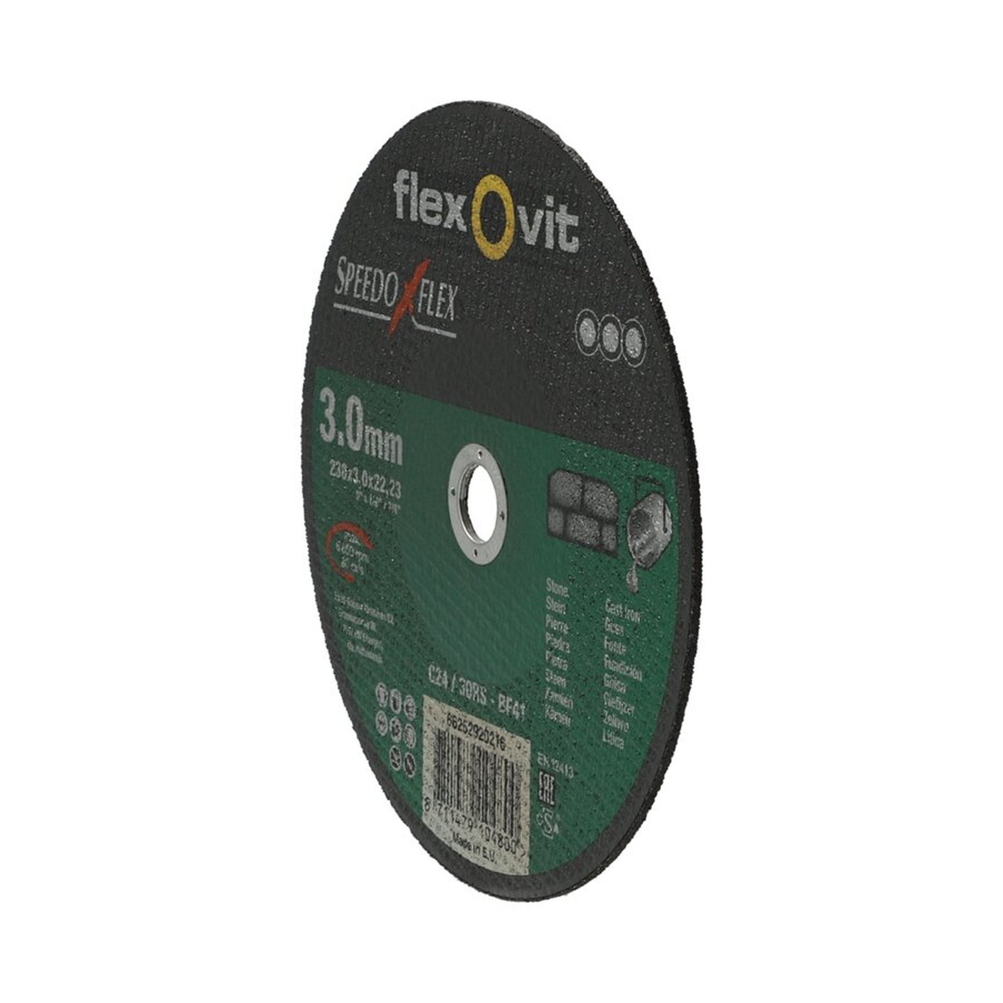 Diese hochleistungsfähige Trennscheibe von Flexovit SPEEDOFLEX (230x3x22.23mm) eignet sich ideal für das Schneiden von Baumaterialien wie Fliesen und Naturstein in verschiedenen Bauanwendungen.,