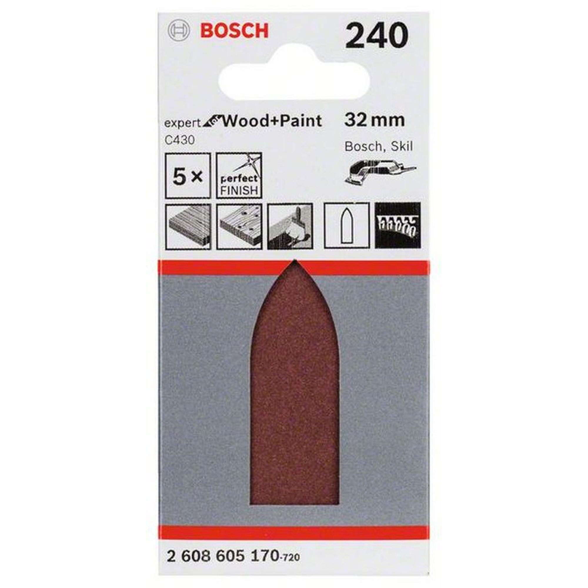 Mit einer Blattabmessung von 32 mm und einer Körnung von 240 ist das Schleifblatt C430 Expert for Wood and Paint vielseitig einsetzbar. Es ist ungelocht, was eine einfache Handhabung ermöglicht.