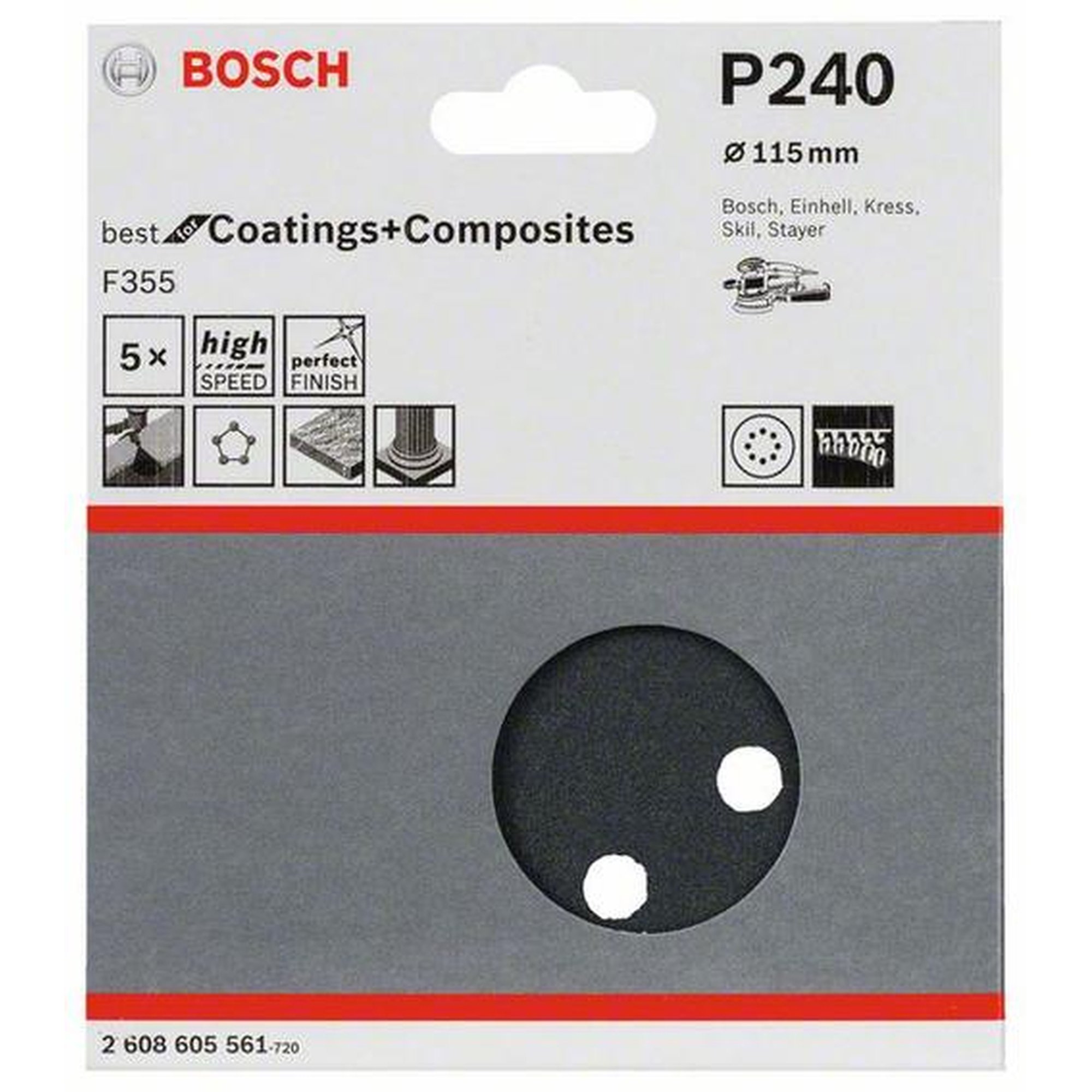 25x BOSCH Schleifblatt F355 für Lack- und Verbundmaterialflächen, 115 mm, 240, 8 Löcher, Klett