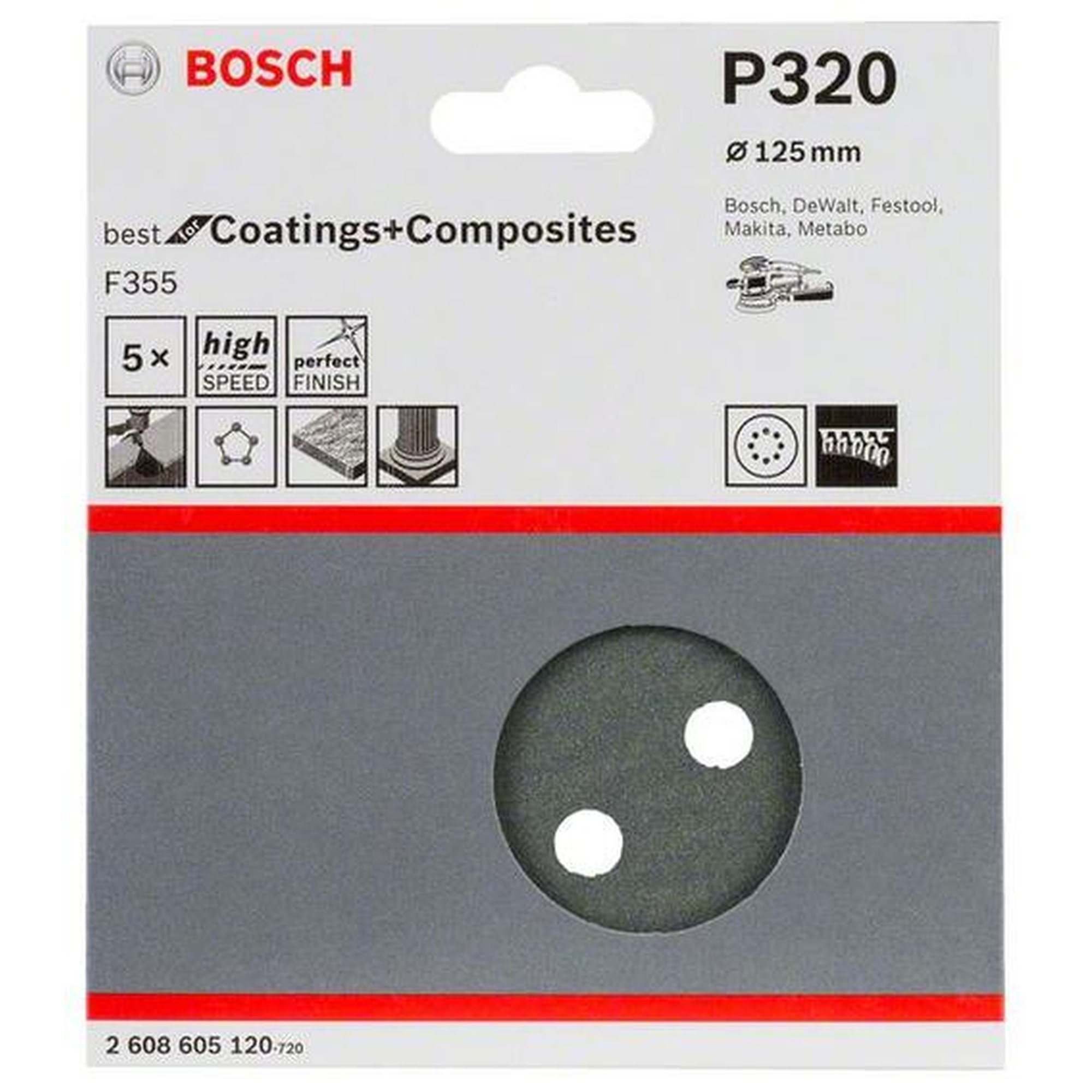 25x BOSCH Schleifblatt F355 für Lack- und Verbundmaterialflächen, 125 mm, 320, 8 Löcher, Klett