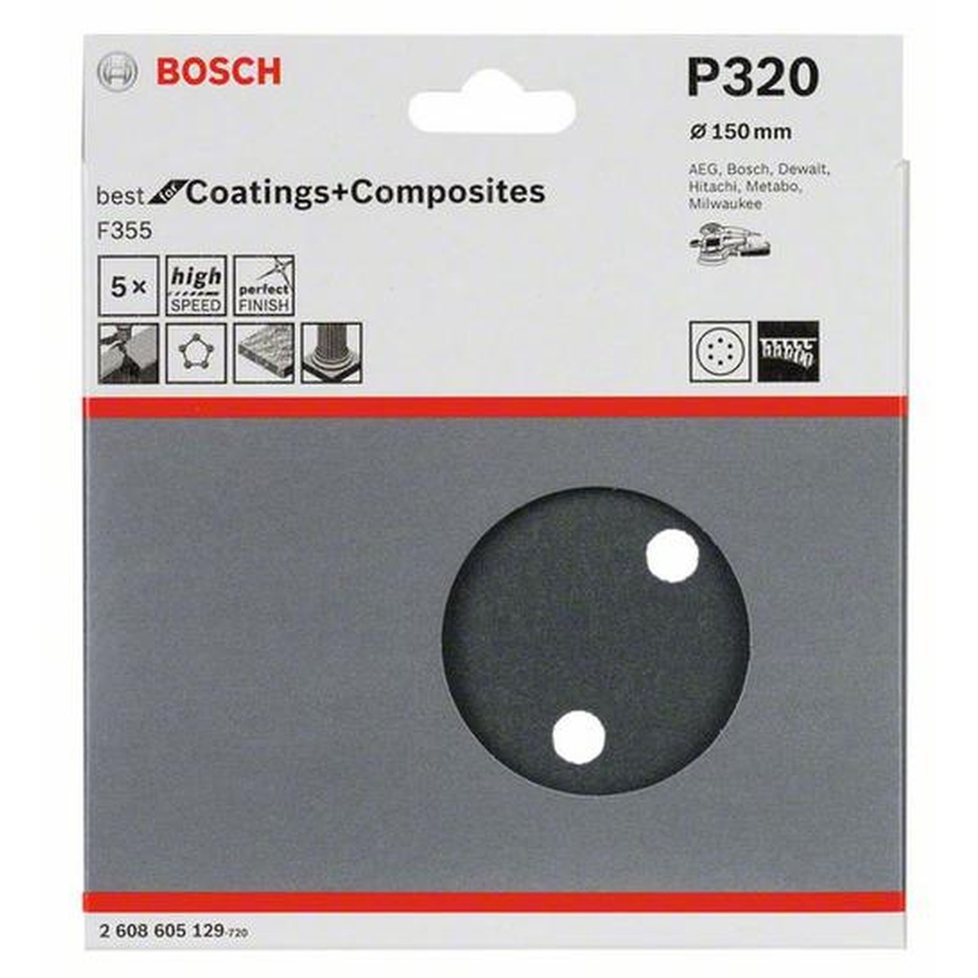 25x BOSCH Schleifblatt F355 für Lack- und Verbundmaterialflächen, 150 mm, 320, 6 Löcher, Klett