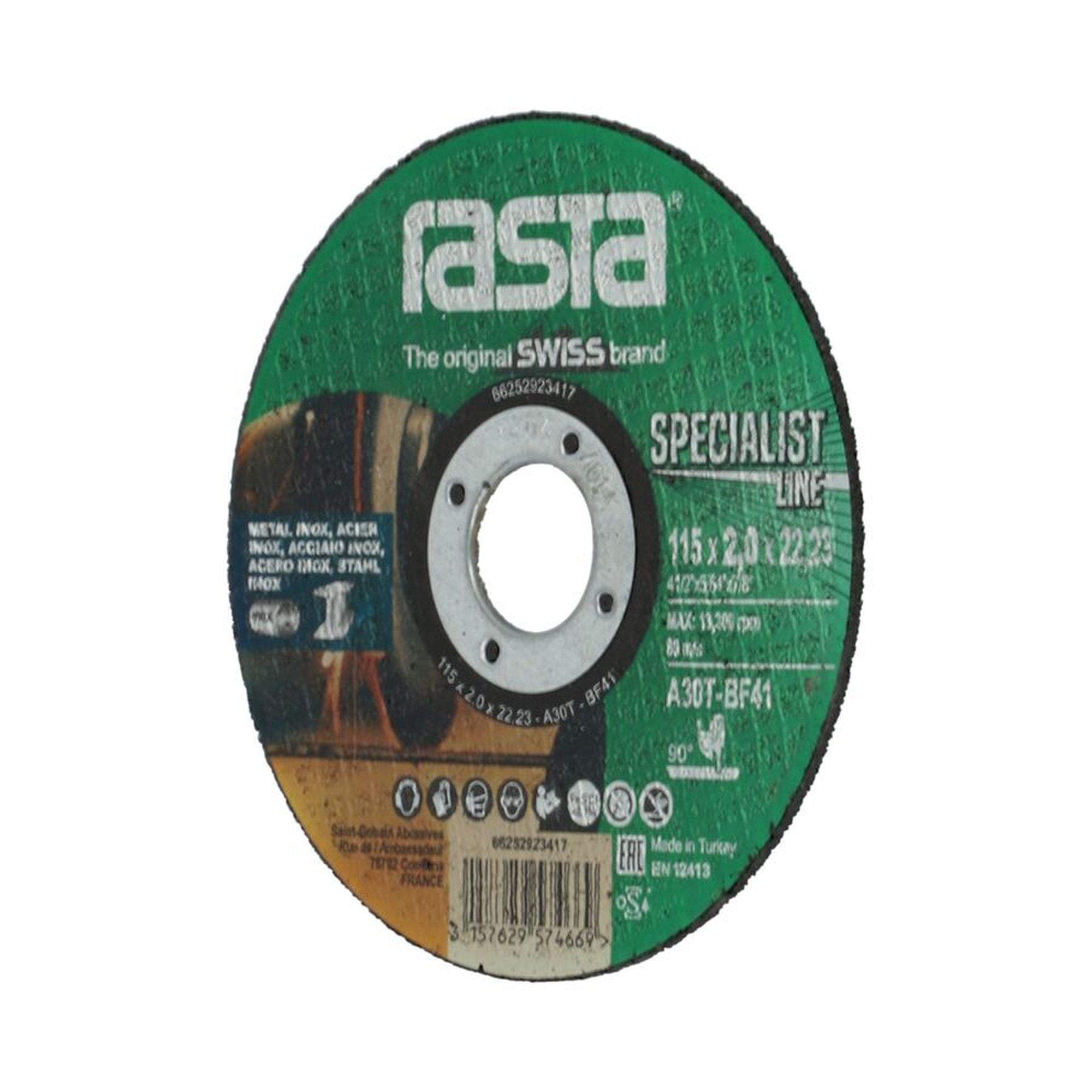 Die A30T RASTA-Spezifikation steht für die Qualität und Effizienz der Scheibe, indem sie eine optimale Balance zwischen Abtragleistung und Abnutzungsrate bietet. Das Produkt mit der Bezeichnung F06-D100-125-Th>1,8 erfüllt zudem hohe Sicherheitsstandards, die für den professionellen Einsatz erforderlich sind.