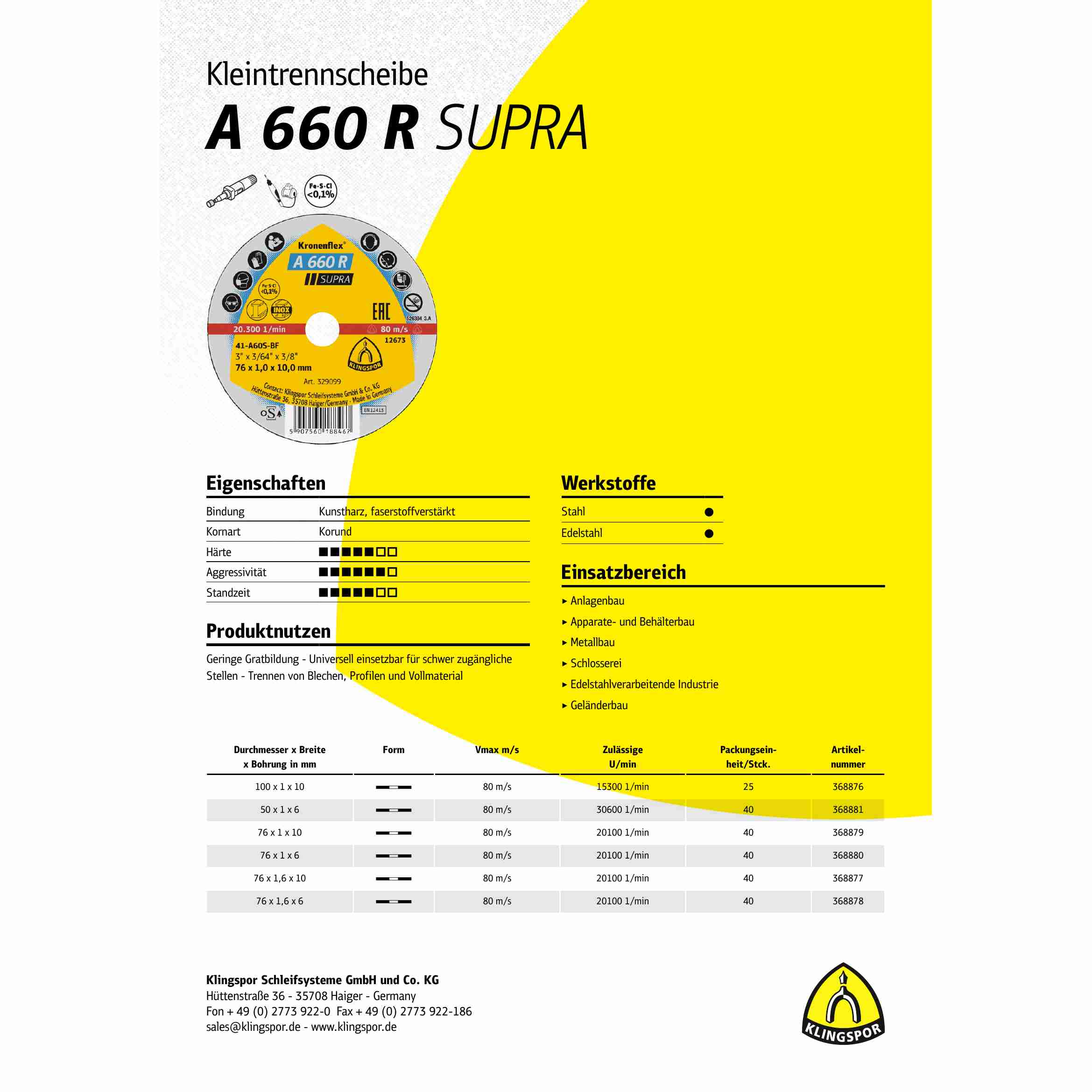 Eigenschaften: Profischeibe mit hoher Schnittleistung. Aufgrund geringer Scheibendicke schnelles Trennen mit geringer Gratbildung. Trennen von Blechen, Profilen und Vollmaterial. Chlor-, eisen- und schwefelfrei. Umweltfreundlich und langlebig