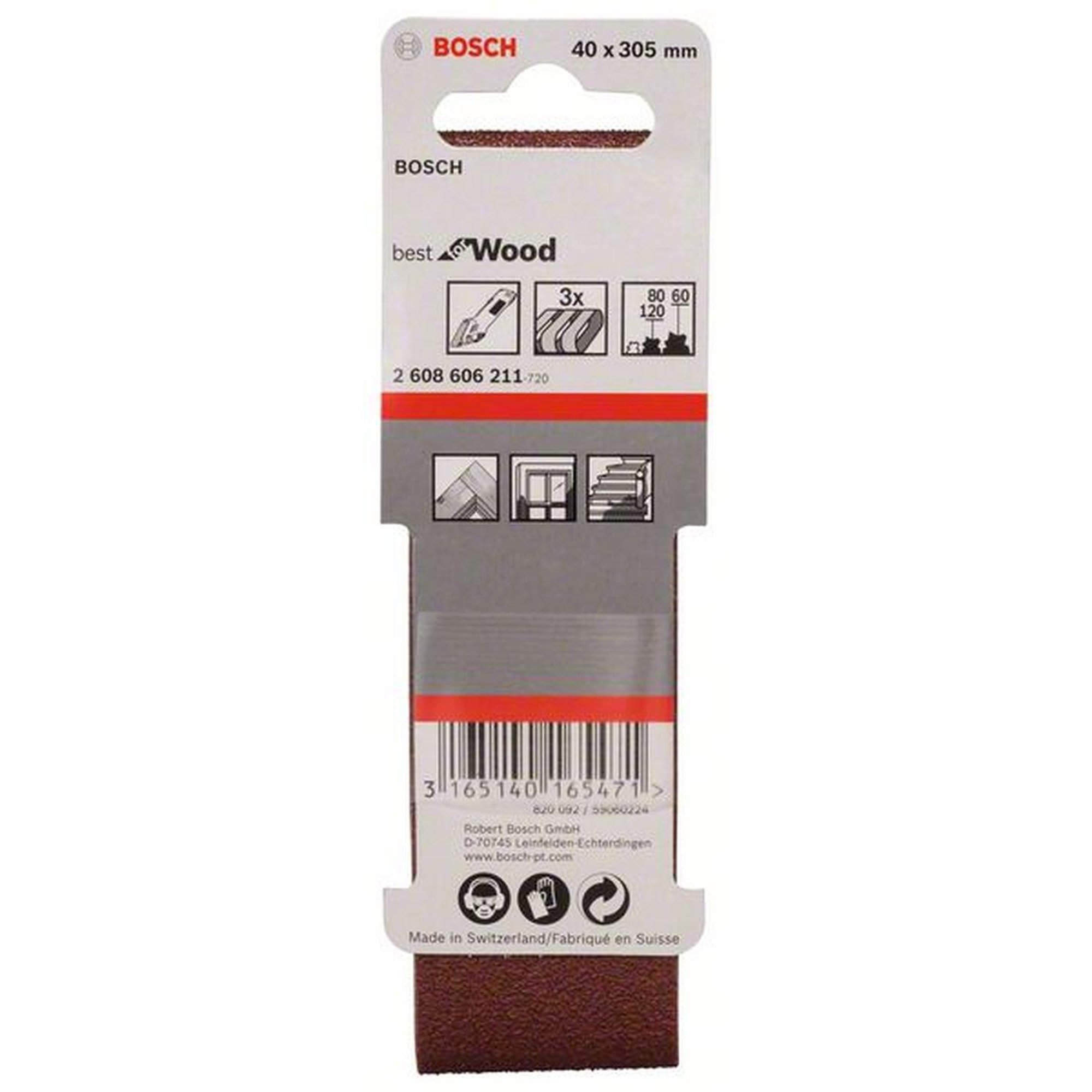 Eigenschaften: Das BOSCH Schleifband-Set X440 3-teilig bietet optimale Schleifleistung für Holz- und Farbschliff. Die Abmessung von 40x305mm passt perfekt zu Bandschleifern