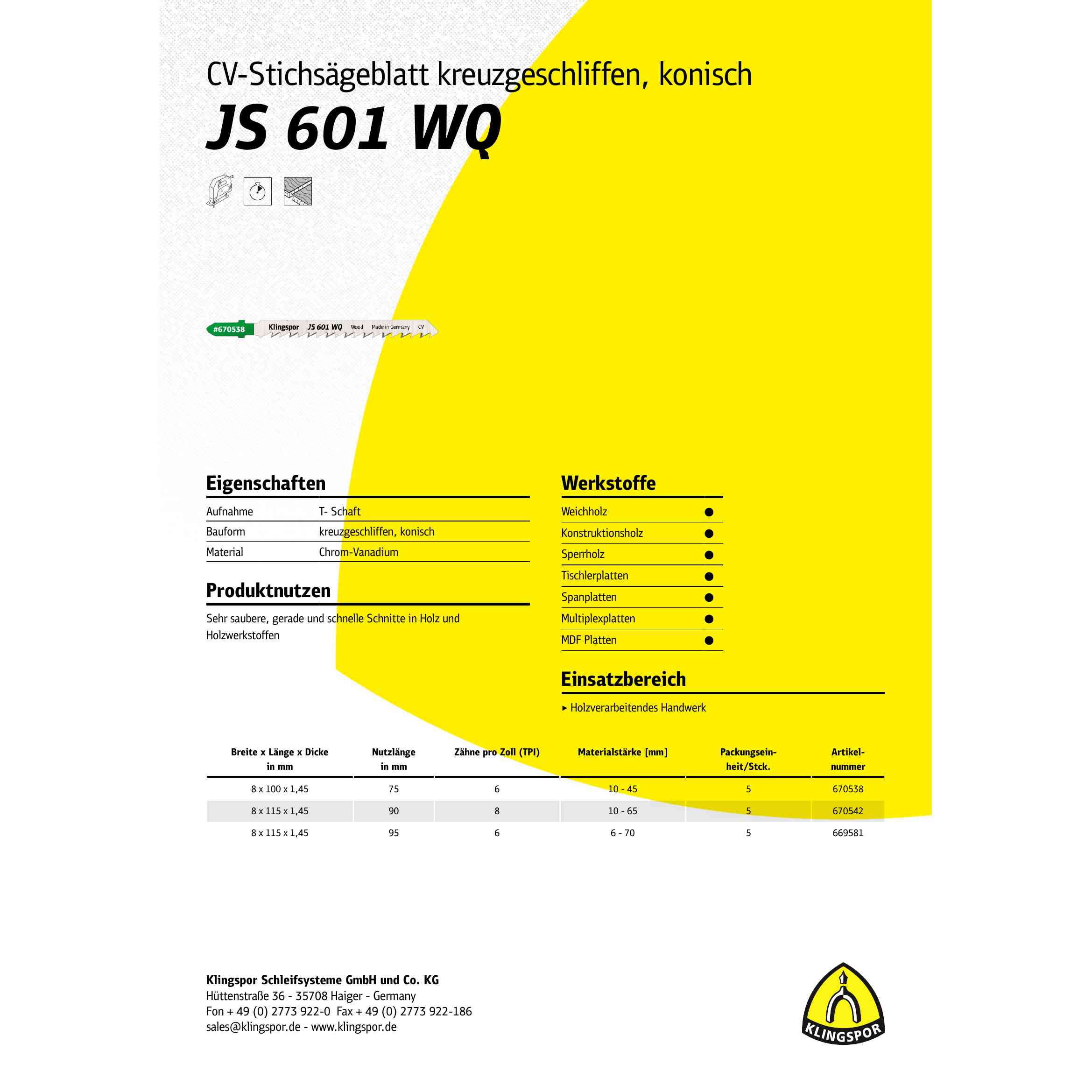 5 x Klingspor JS 601 WQ Stichsägeblätter 115 x 8 x 1,45 mm Nutzlänge 95Crom-Vanadium kreuzgeschliffen, konisch, 6 Zähne pro Zoll