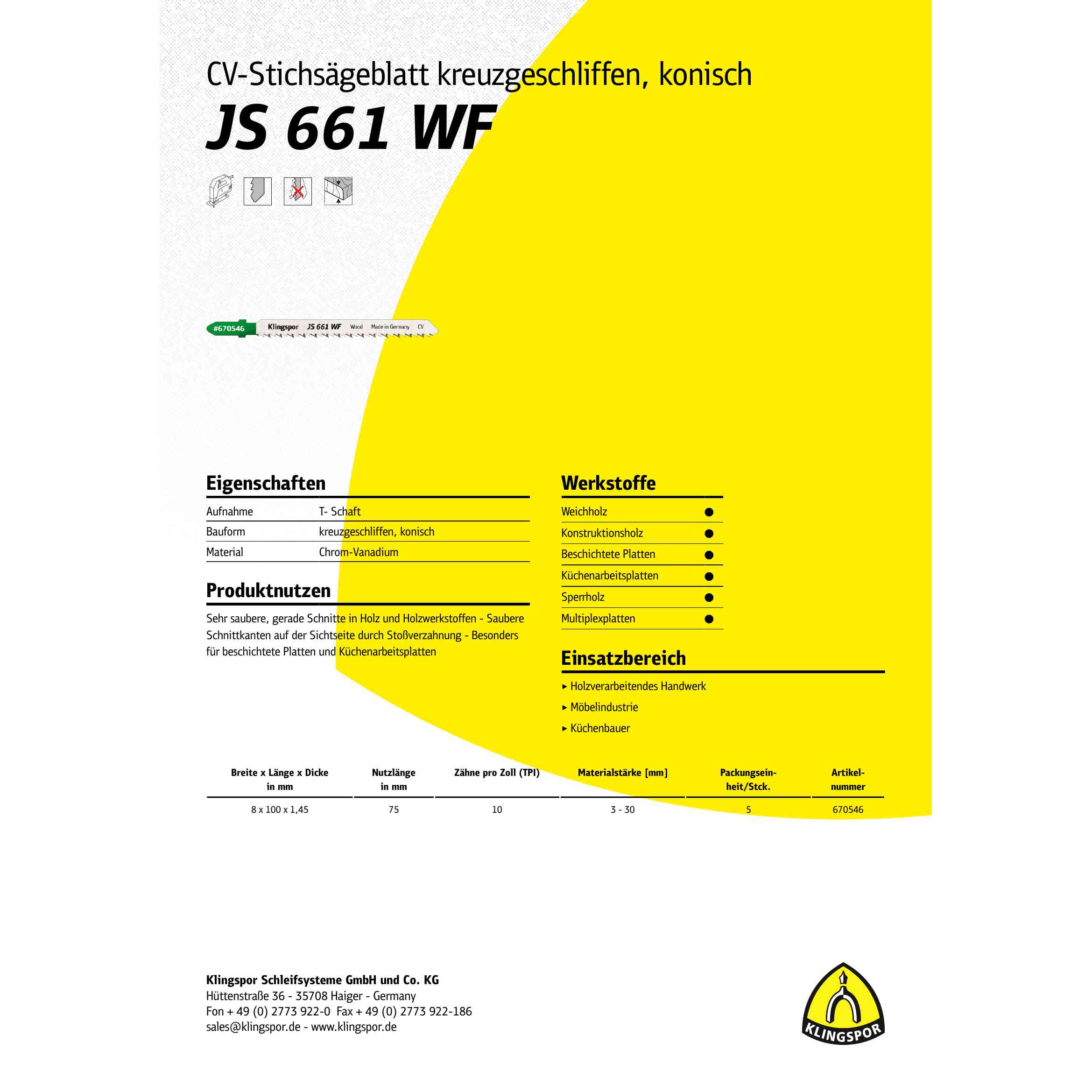 5 x Klingspor JS 661 WF Stichsägeblätter 100 x 8 x 1,45 mm Nutzlänge 75Crom-Vanadium kreuzgeschliffen, konisch, 10 Zähne pro Zoll