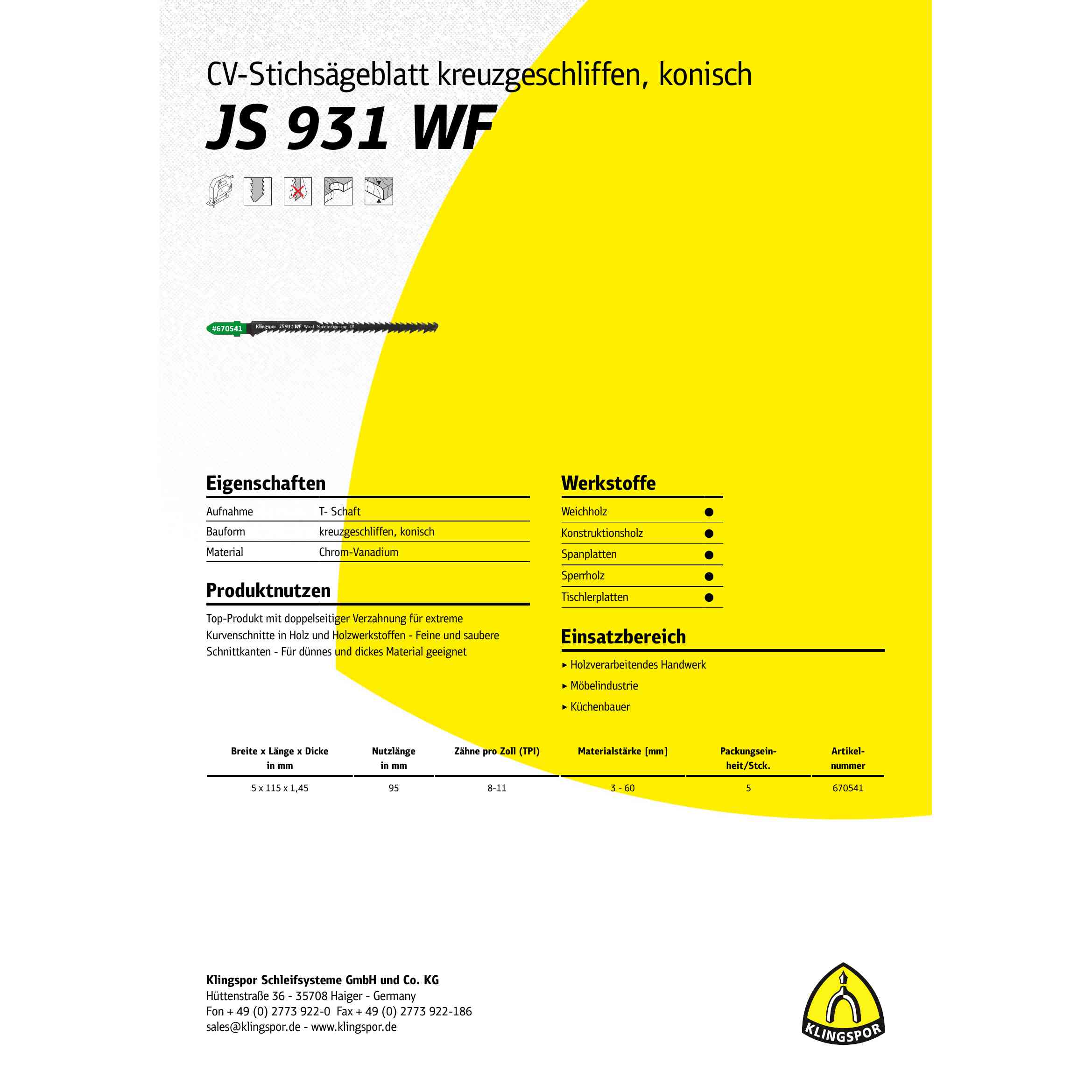 5 x Klingspor JS 931 WF Stichsägeblätter 115 x 5 x 1,45 mm Nutzlänge 95Crom-Vanadium kreuzgeschliffen, konisch, 8-11 Zähne pro Zoll