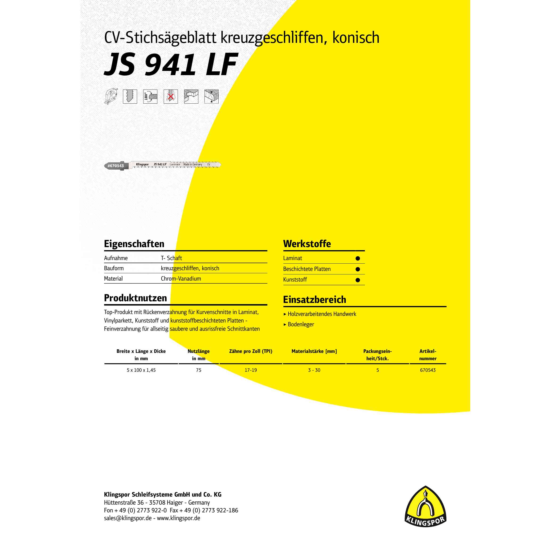 5 x Klingspor JS 941 LF Stichsägeblätter 100 x 5 x 1,45 mm Nutzlänge 75Crom-Vanadium kreuzgeschliffen, konisch, 17-19 Zähne pro Zoll