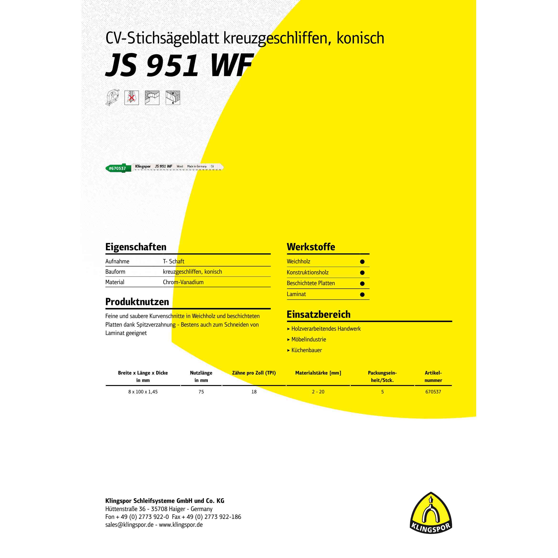 5 x Klingspor JS 951 WF Stichsägeblätter 100 x 8 x 1,45 mm Nutzlänge 75Crom-Vanadium kreuzgeschliffen, konisch, 18 Zähne pro Zoll