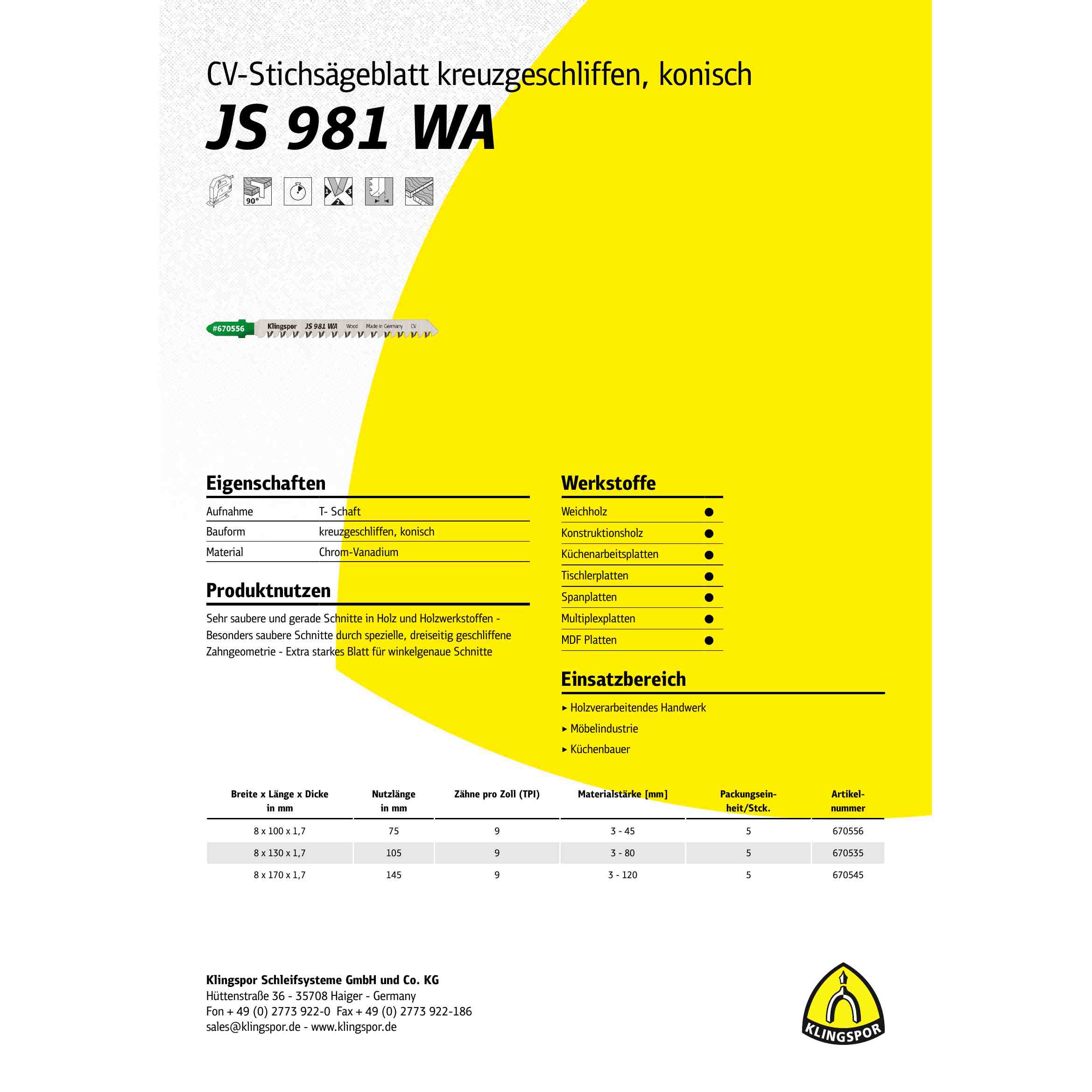 5 x Klingspor JS 981 WA Stichsägeblätter 100 x 8 x 1,7 mm Nutzlänge 75Crom-Vanadium kreuzgeschliffen, konisch, 9 Zähne pro Zoll