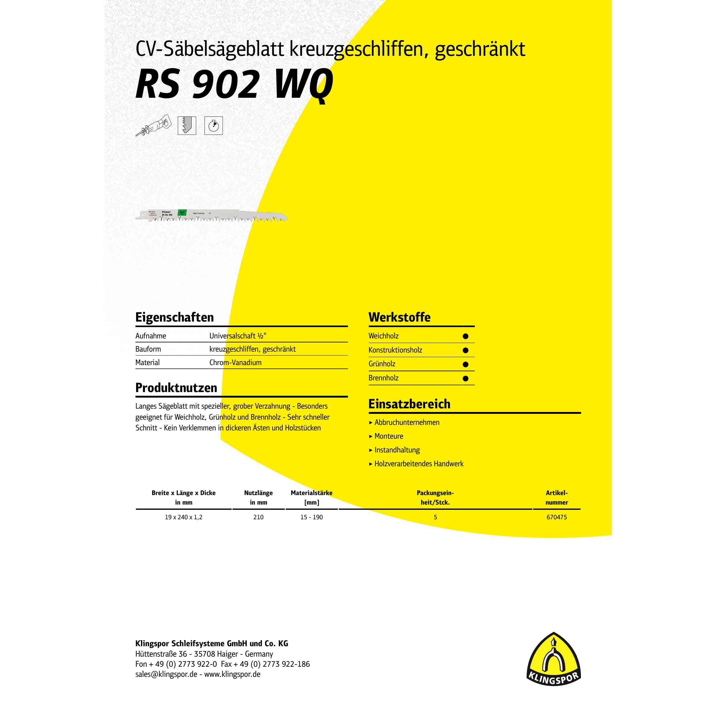 5 x Klingspor RS 902 WQ Säbelsägeblätter 240 x 19 x 1,2 mm Nutzlänge 210Crom-Vanadium kreuzgeschliffen, geschränkt, 5 Zähne pro Zoll