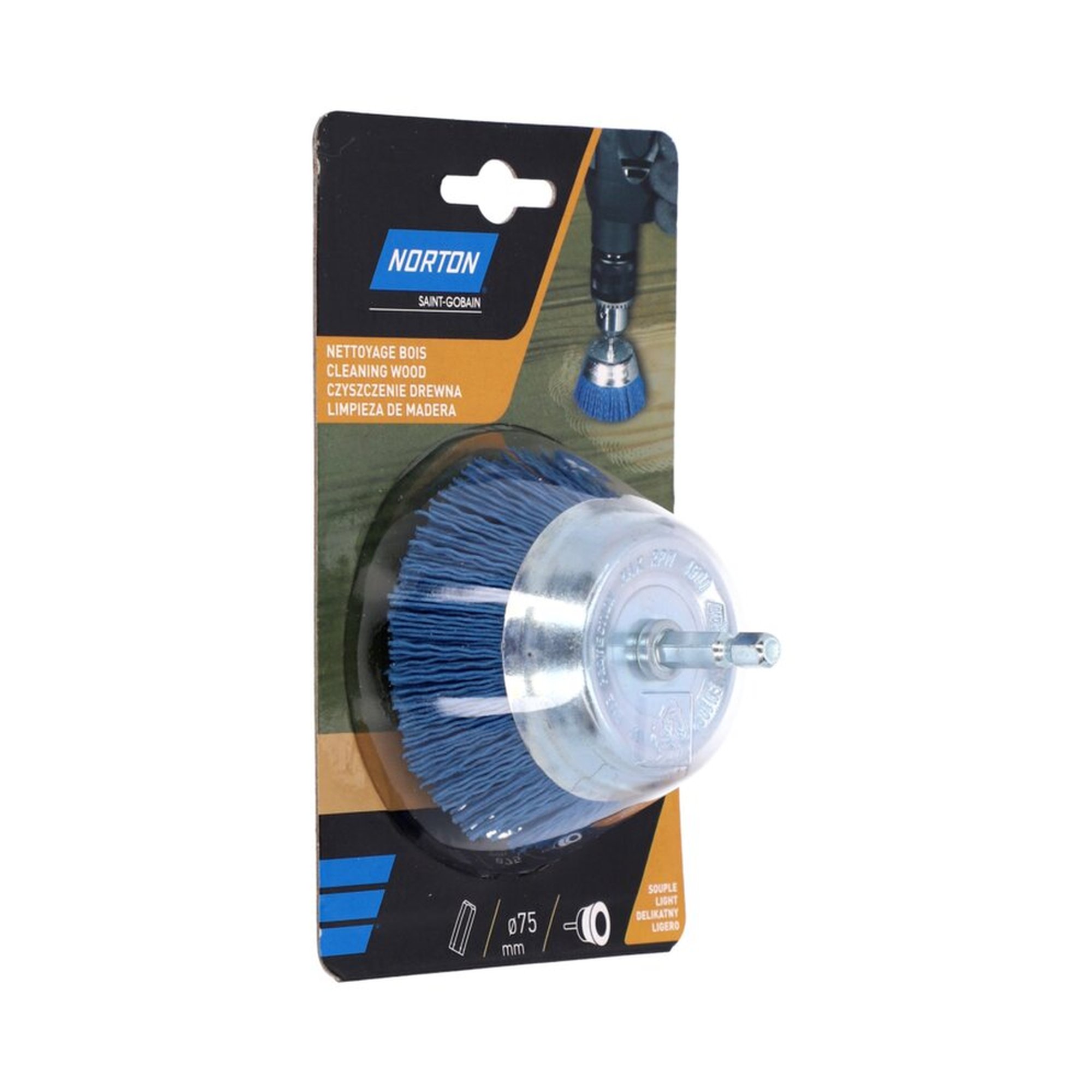 Die Norton Topfbürste mit blauem Nylondraht ist das ideale Werkzeug für effizientes Reinigen und Abziehen von Holzoberflächen. Mit einer Größe von 75mm und einem 6mm Schaftdurchmesser passt diese Bürste perfekt in Standard-Handbohrer und ist besonders benutzerfreundlich.