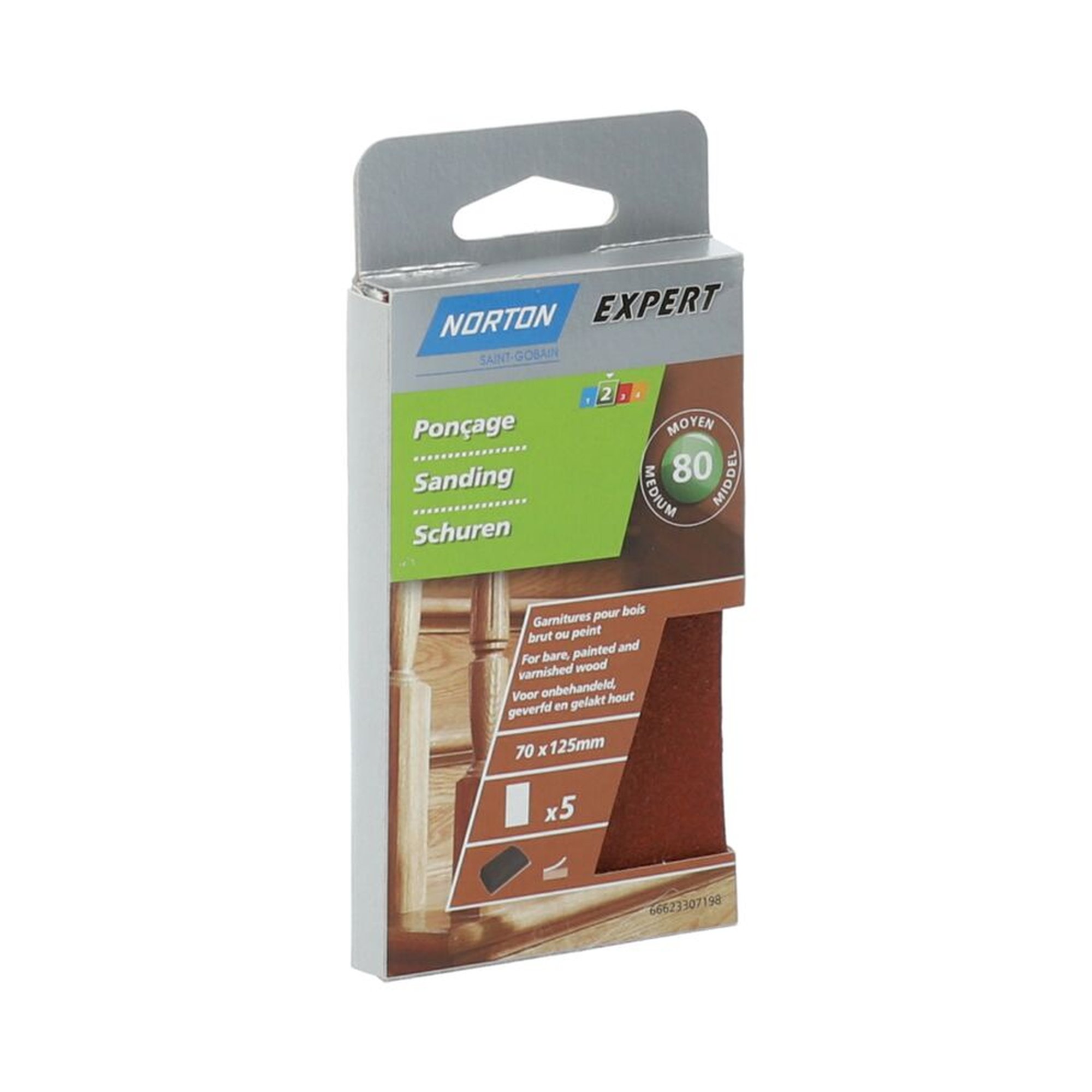 5 Schleifstreifen von Norton Expert, 70x125mm, Körnung K80. Ideal für anspruchsvolle Heimwerkerarbeiten, sicher und effizient für jede Schleifphase.,
