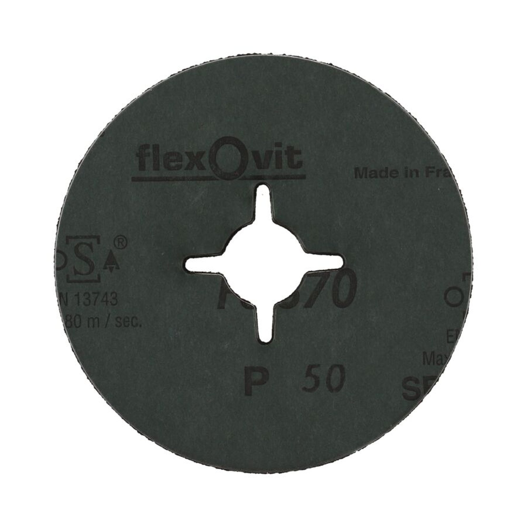 Hochleistungsfähige Fiberscheiben von Flexovit, 115x22mm, Körnung 50, ideal für effektives Schleifen von Stahl mit Winkelschleifern.,