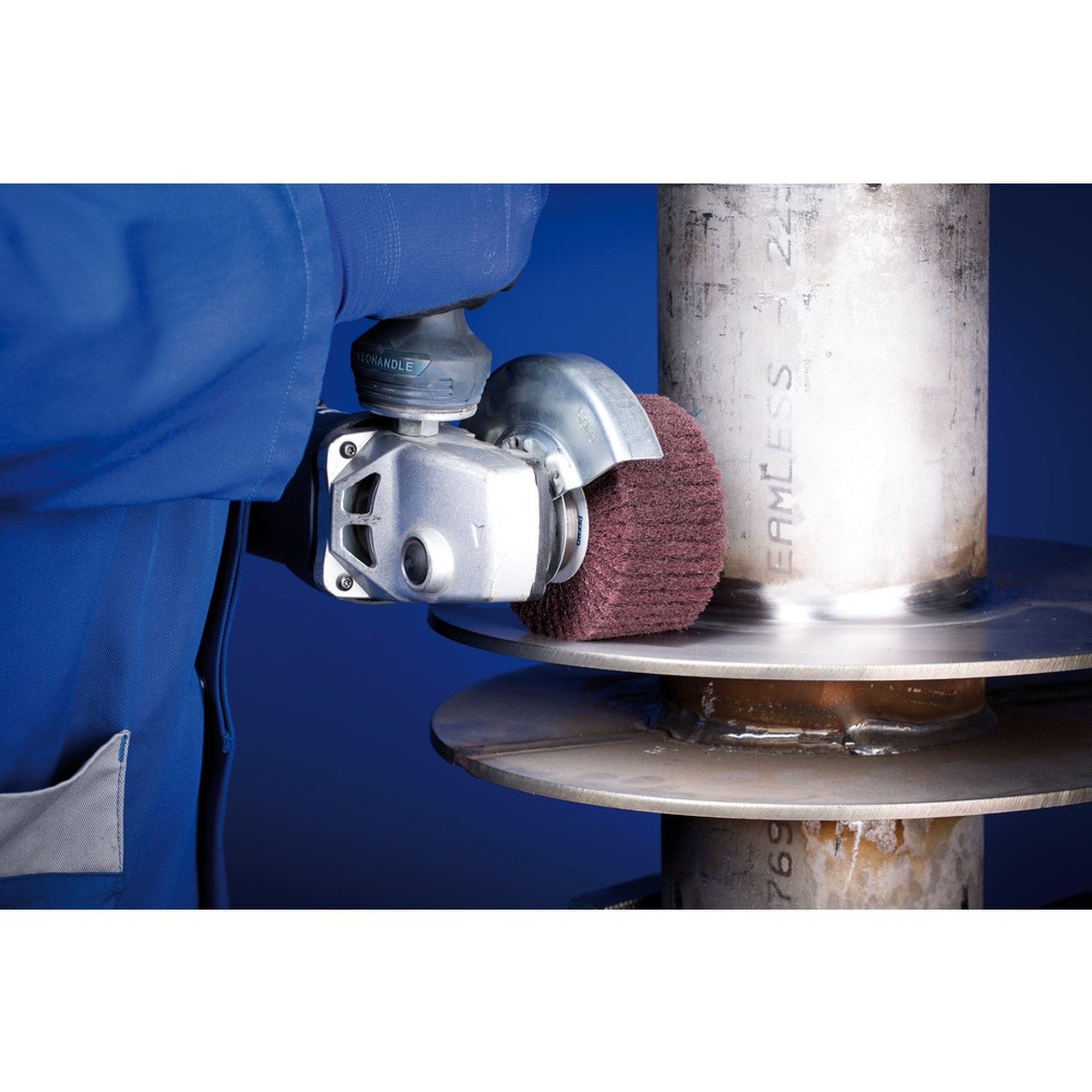 Eigenschaften: Lamellenförmige radiale Anordnung des Schleifvlieses für effiziente und gleichmäßige Schleifwirkung. Hohe Standzeit durch dicht verpackte Lamellen. Einfache Montage auf drehzahlregelbare Winkelschleifer und Kehlnahtschleifer