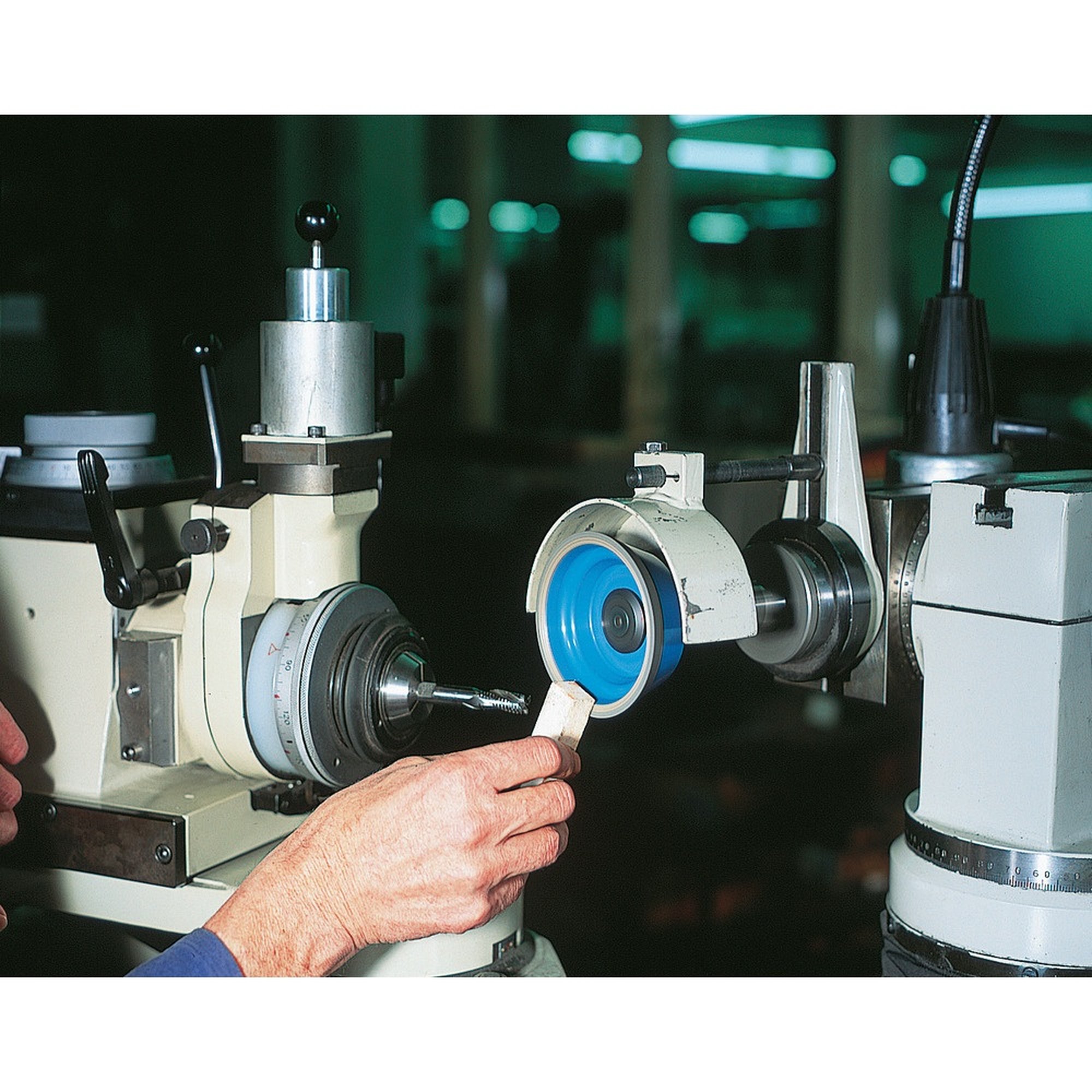 Der Schärfblock wird vor der Anwendung zunächst mit Kühlmittel getränkt, um eine optimale Schleifwirkung zu erzielen. Anschließend kann er entweder von Hand oder mittels einer Vorrichtung zugeführt werden. Durch das Abschleifen des Schärfblocks wird die Schneidfähigkeit der Schleifscheiben sehr schnell wiederhergestellt, sodass Sie Ihre Arbeit ohne Unterbrechung fortsetzen können.