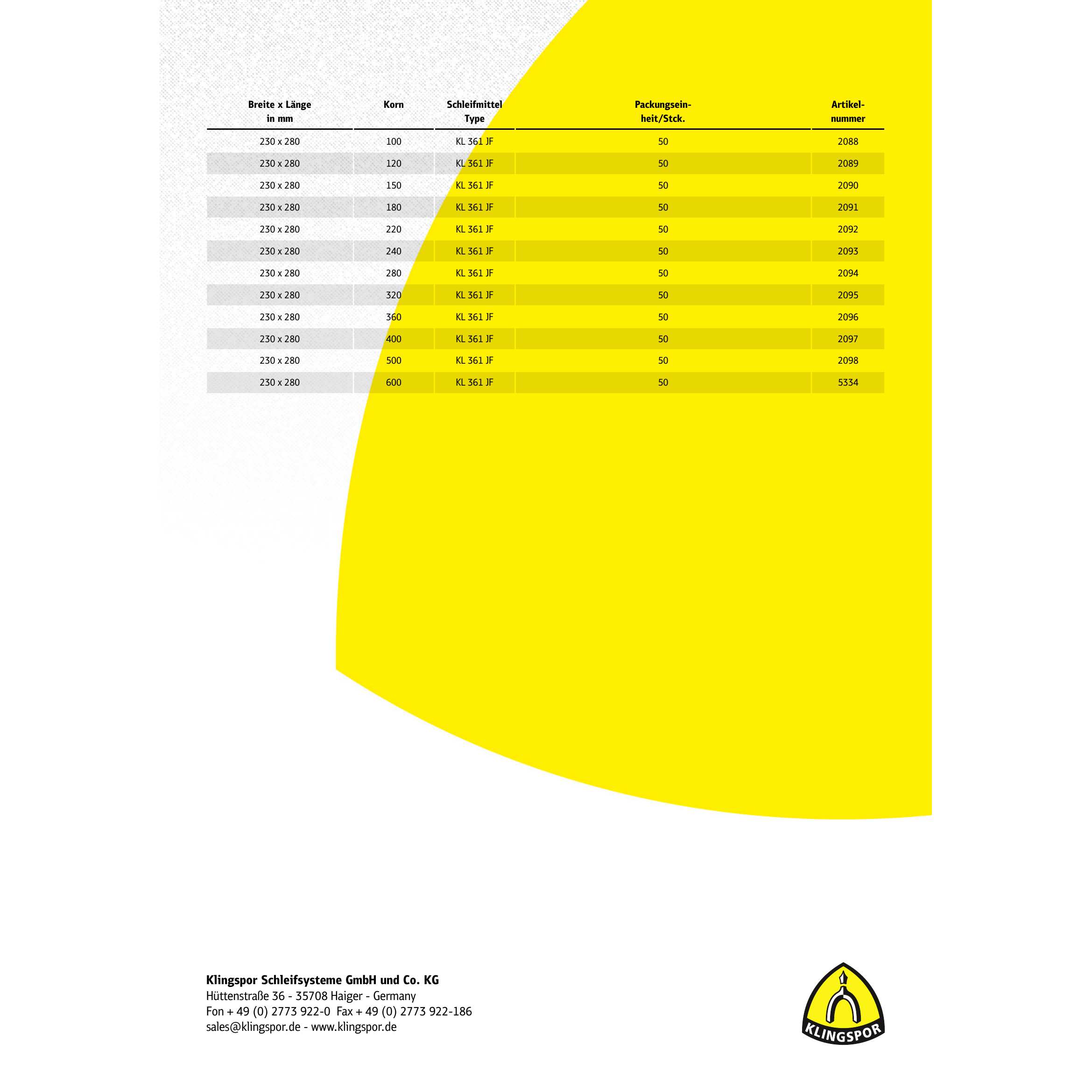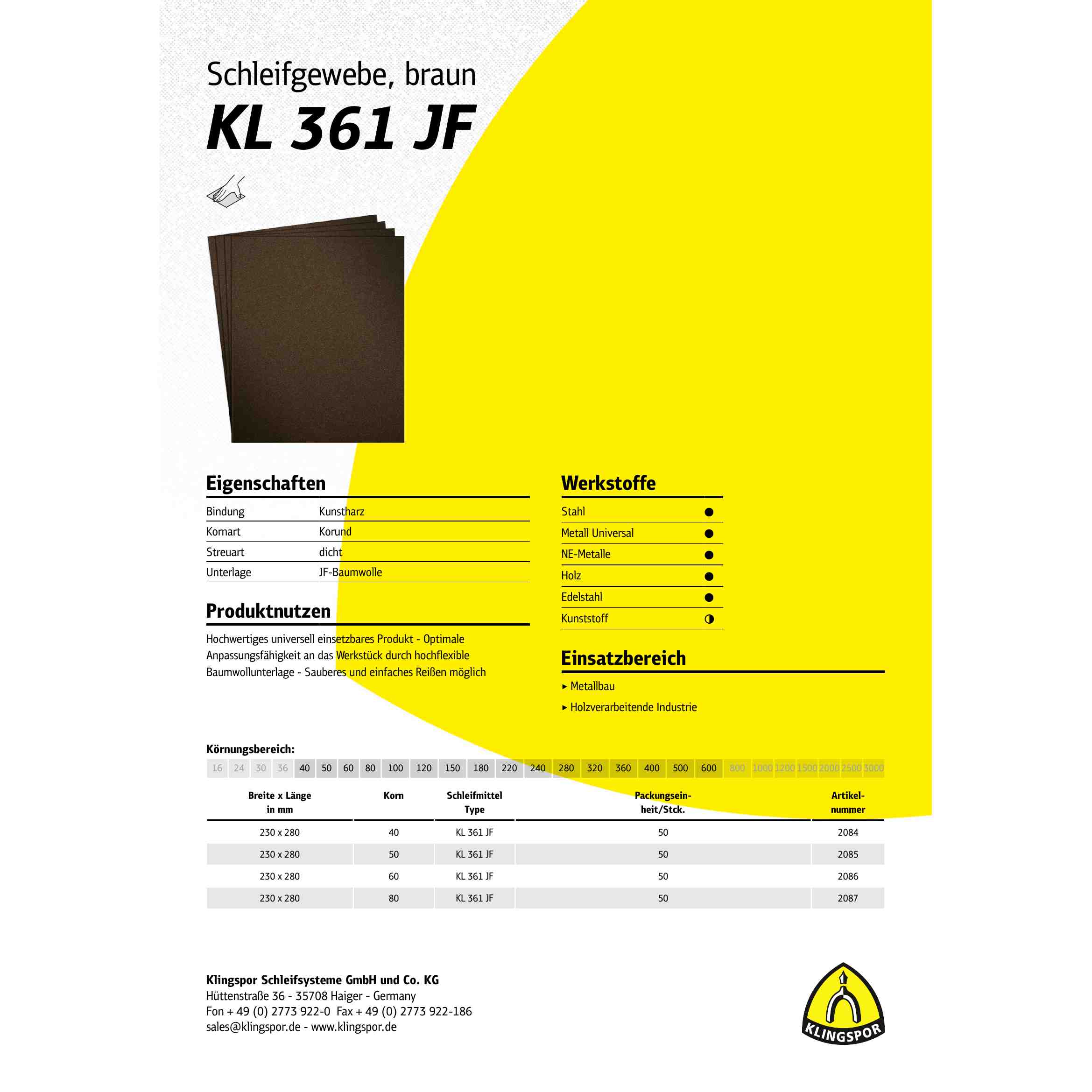 50 x Klingspor KL 361 JF Bogen, 230 x 280 mm Korn 180
