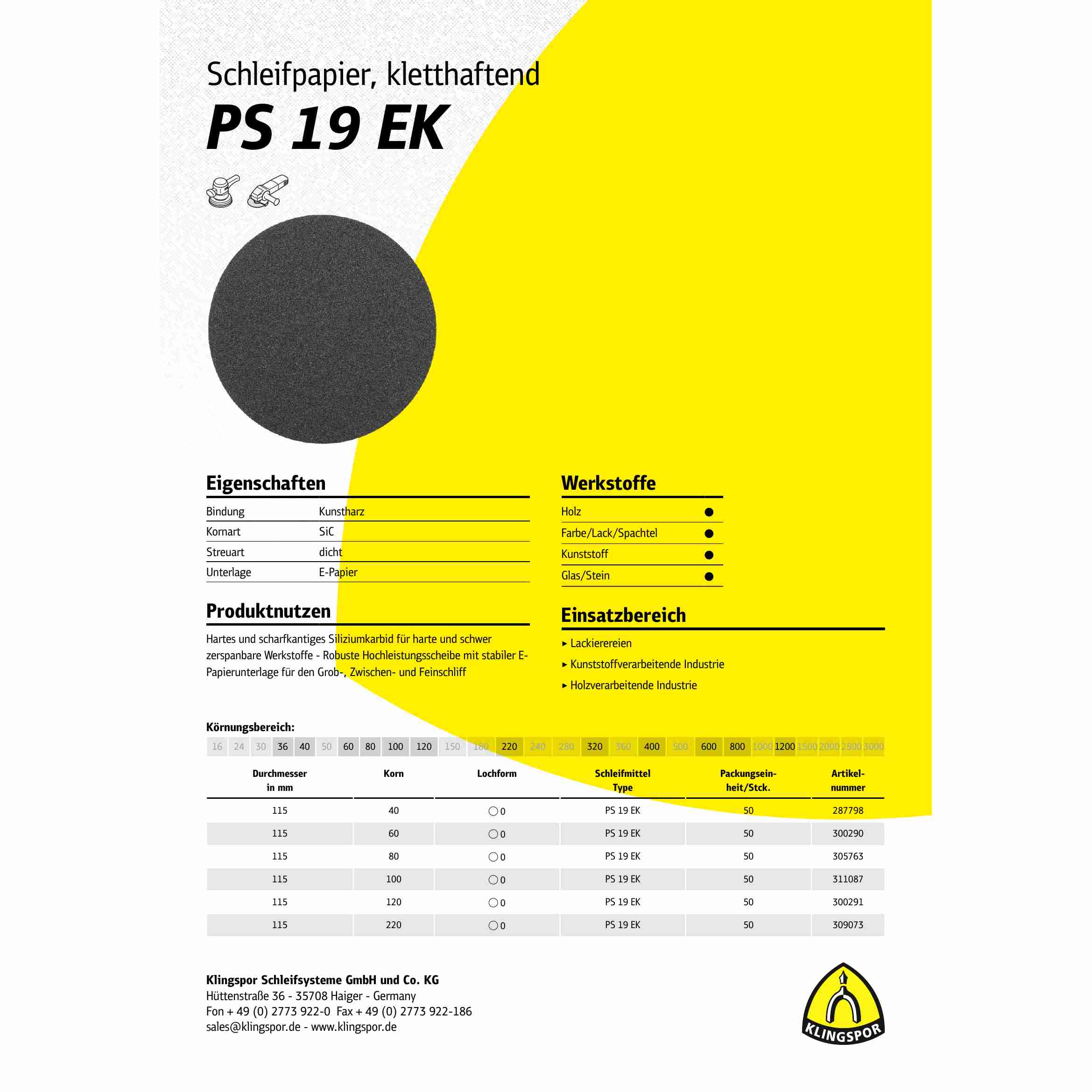 Besonderheiten: Die Klingspor PS 19 EK Scheiben sind ein robustes Hochleistungsprodukt mit einer stabilen E-Papierunterlage, welches sich für den Grob-, Zwischen- und Feinschliff eignet