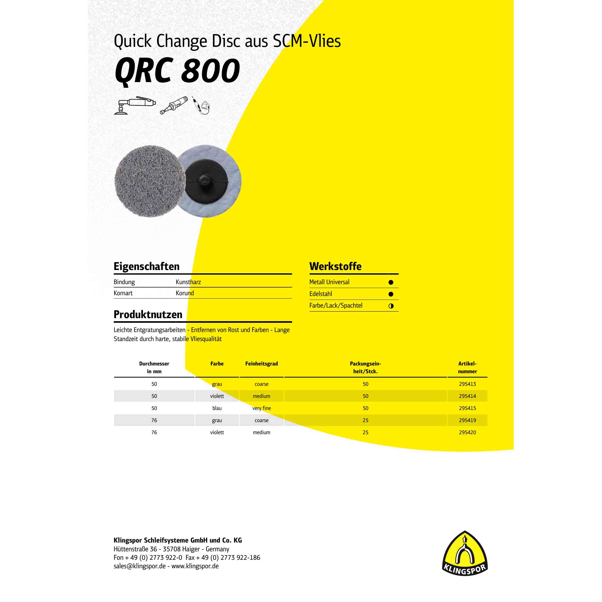 Eigenschaften: Die Klingspor QRC 800 Quick change discs sind robuste und langlebige harte Vliesscheiben, die sich ideal zum Entfernen von Rost und Farben, für leichte Entgratungsarbeiten und zur Beseitigung von Vorschleifspuren eignen