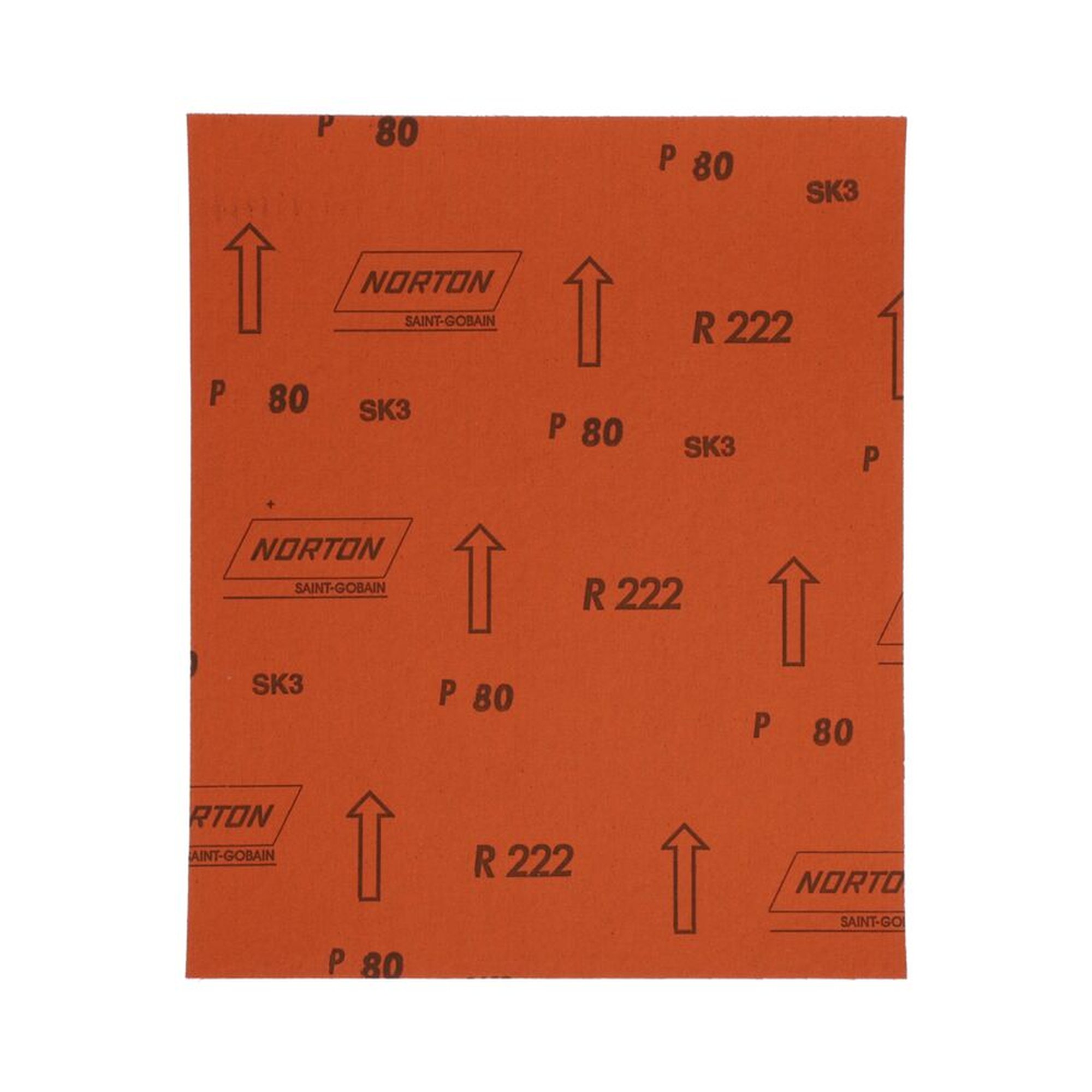 Hochflexible Norton R222 Schleifbögen aus J-Gewebe, ideal für Konturen und Rundungen. Geeignet für Holz, Metalle und mehr. Maße: 230x280mm, Körnung K80.,