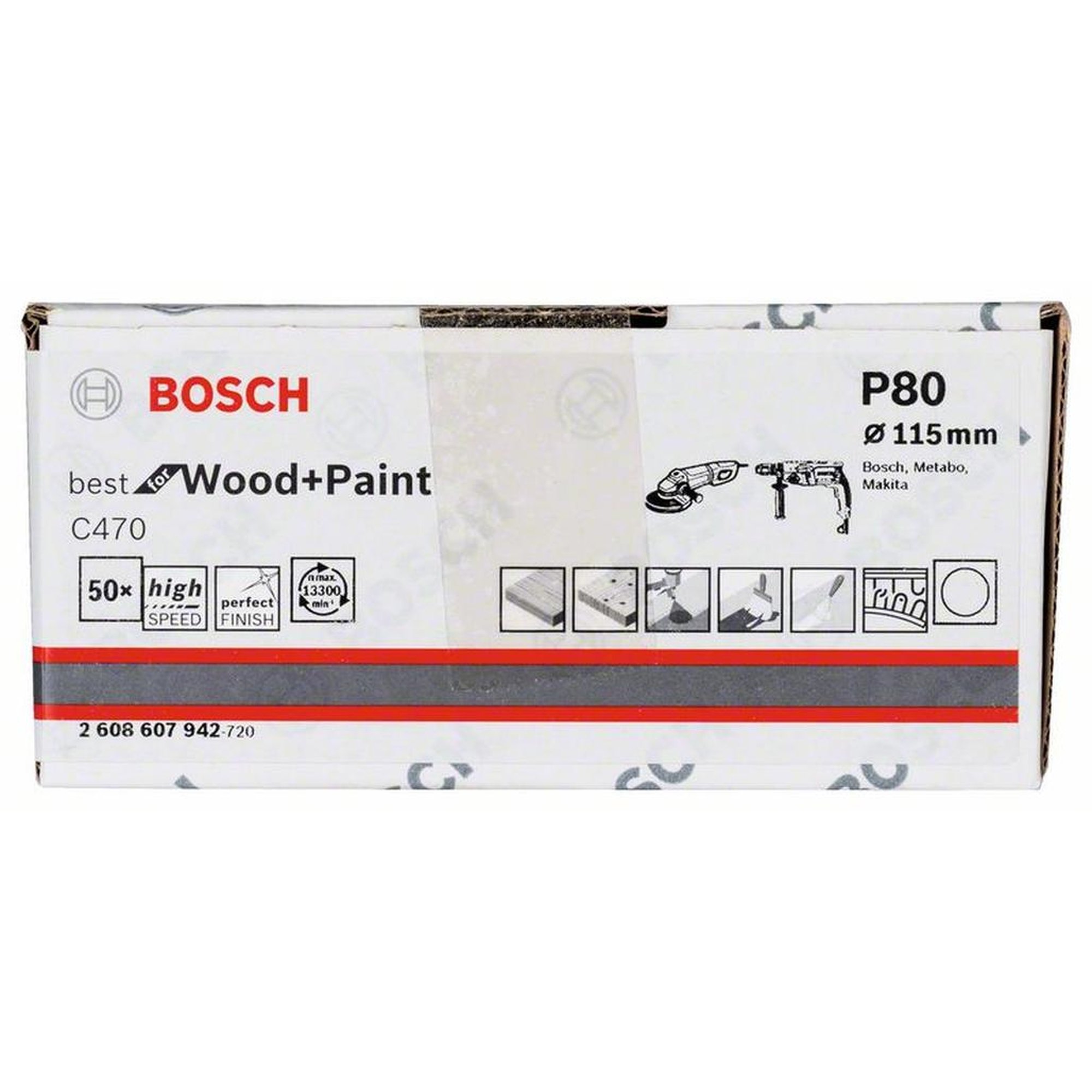 50x BOSCH Schleifblatt Papier C470 für Holz und Farbe, 115 mm, 80, ungelocht, Klett