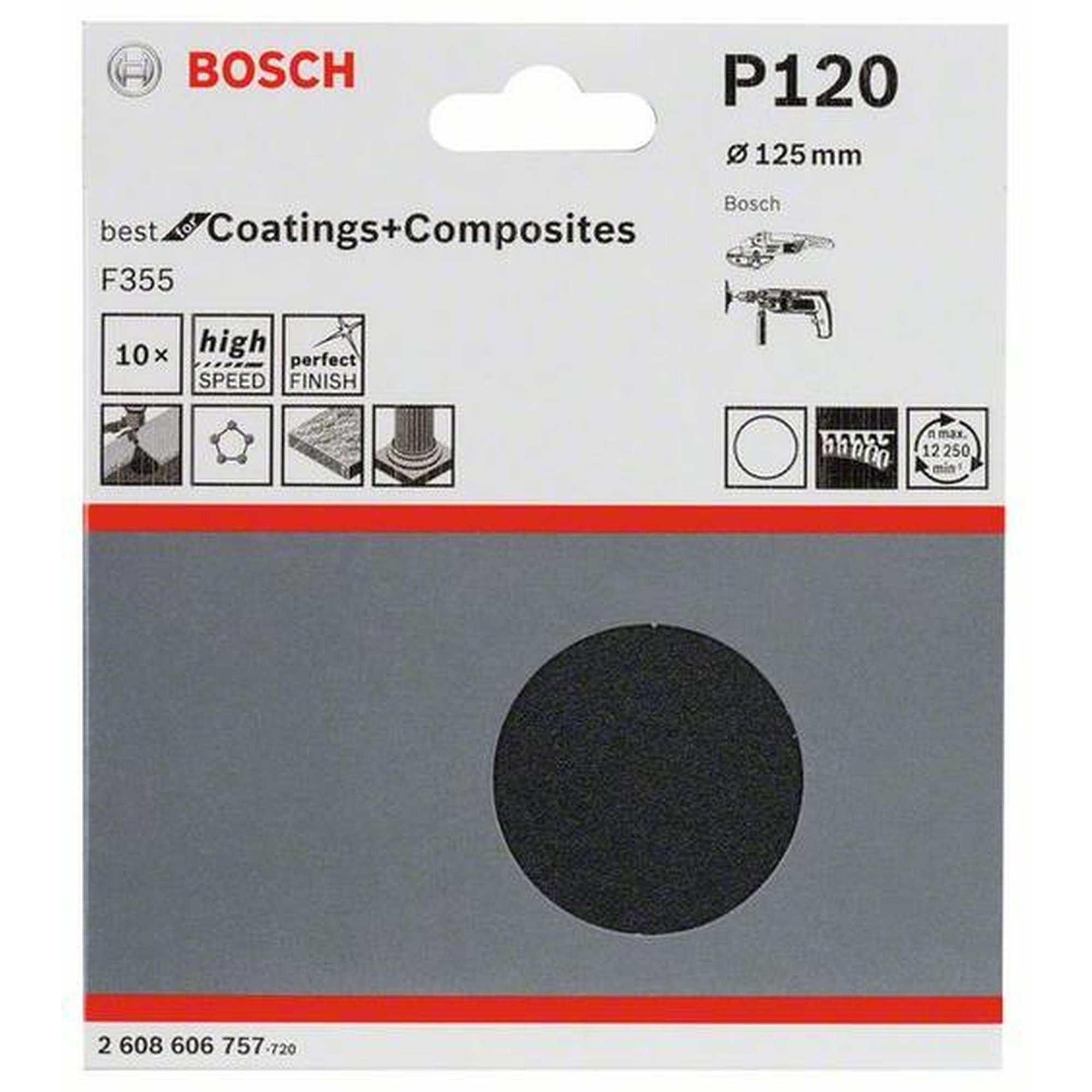50x BOSCH Schleifscheibe Papier F355 für Stein und Verbundmaterial, Ø 125 mm, 120, ungelocht, Klett