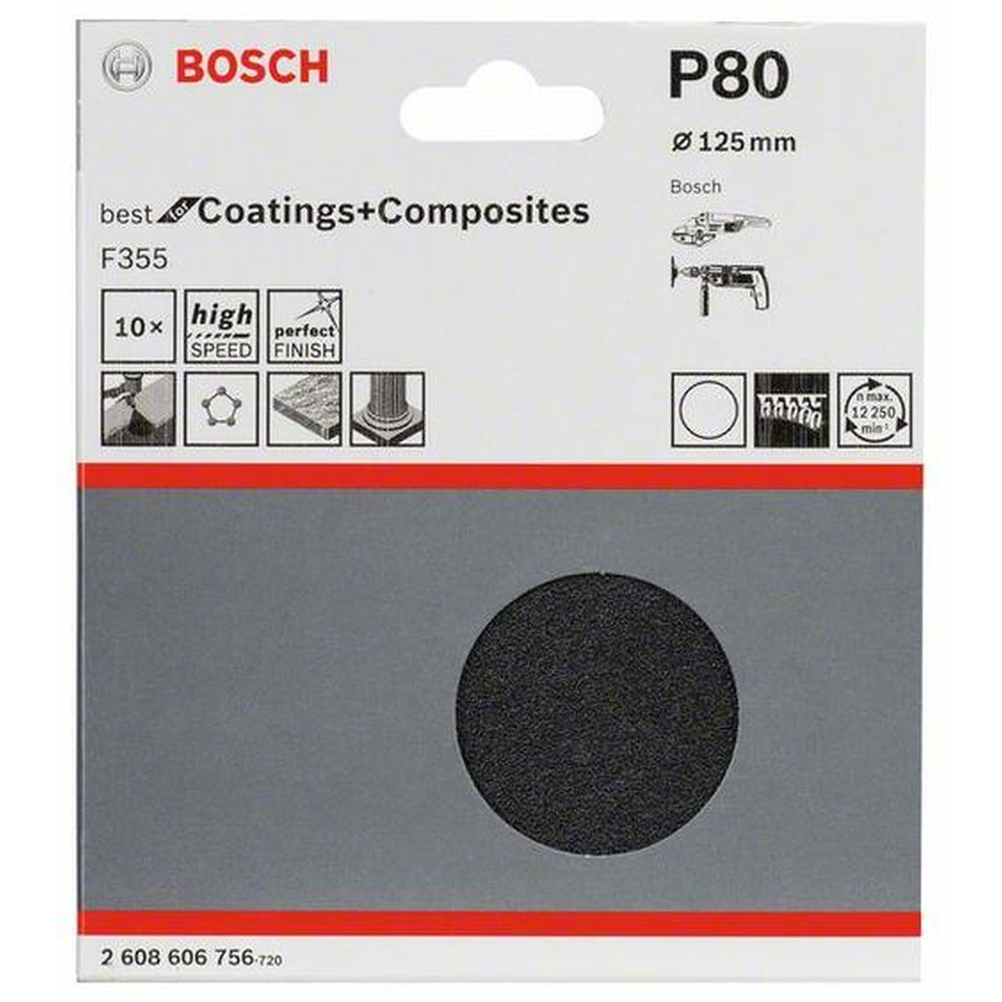 50x BOSCH Schleifscheibe Papier F355 für Stein und Verbundmaterial, Ø 125 mm, 80, ungelocht, Klett