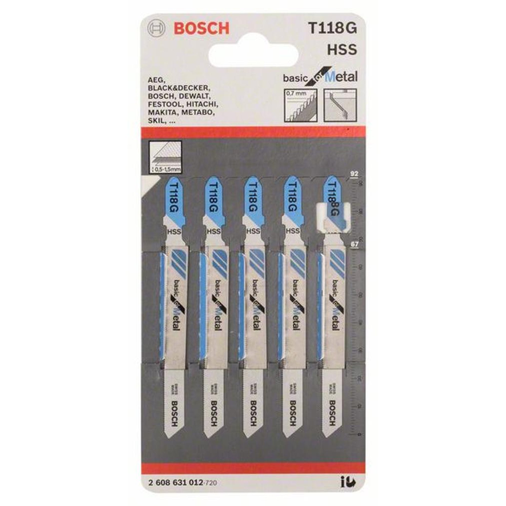 Merkmale: Das T 118 G Basic for Metal Stichsägeblatt von BOSCH ermöglicht präzise gerade Schnitte in Metall. Es ist aus hochwertigem gehärtetem Hochgeschwindigkeitsstahl gefertigt und eignet sich ideal für nicht perforierte Metallbleche mit Standard