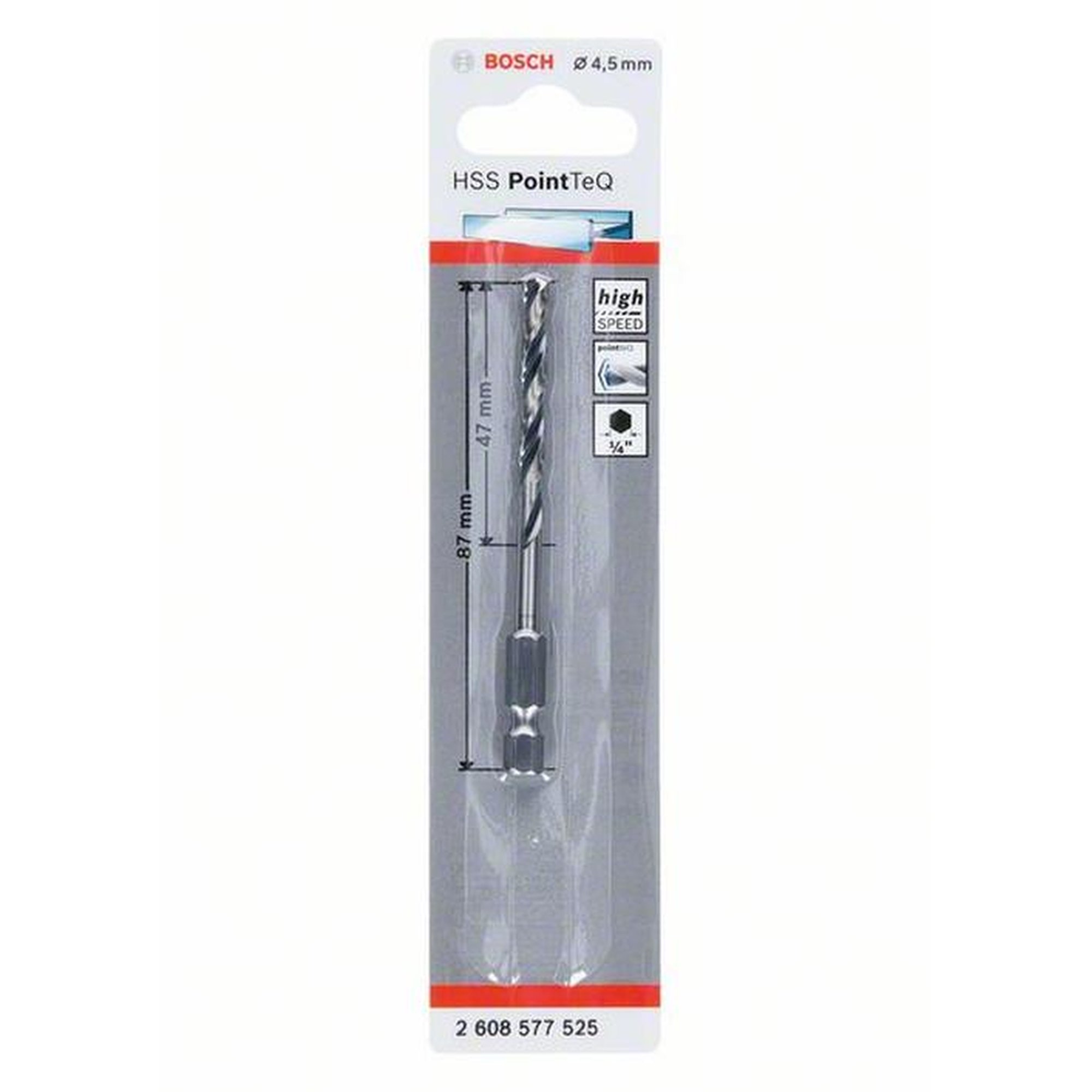 Der HSS-Spiralbohrer PointTeQ mit Kreuzanschliff ermöglicht ein perfektes Zentrieren und ist gemäß DIN 338 als Typ N (kleiner Seitenspanwinkel) mit einem 135°-Design hergestellt. Mit einer Arbeitslänge von 47 mm und einer Gesamtlänge von 87 mm ist er vielseitig einsetzbar und kompatibel mit Sechskantschaftsystemen (1/4-Zoll).