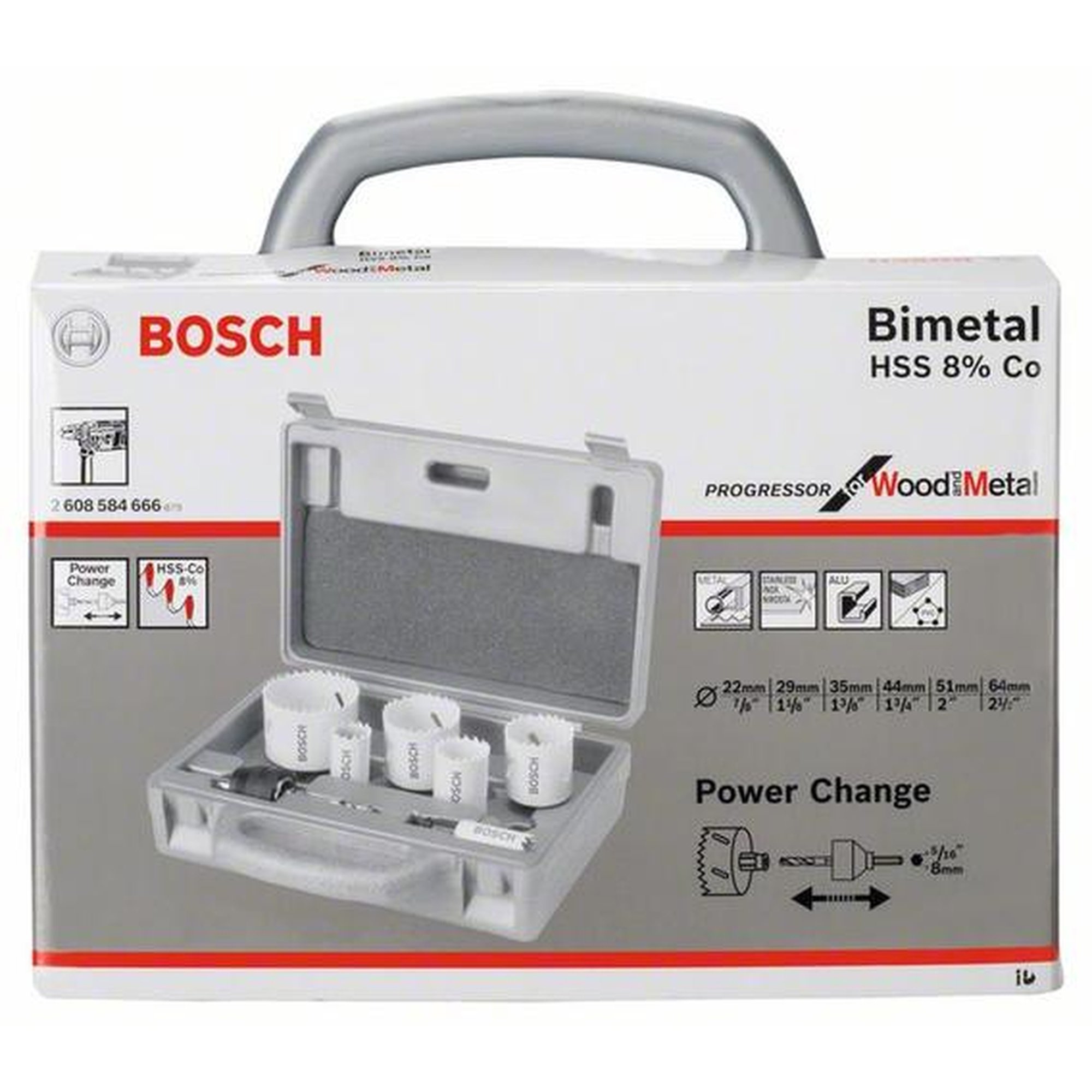 Eigenschaften: Das BOSCH 9tlg. Lochsägen-Set Progressor Elektriker Ø 22/29/35/44/51/64mm zeichnet sich durch seine hochwertige Verarbeitung und präzise Schnittleistung in Holz und Metall aus