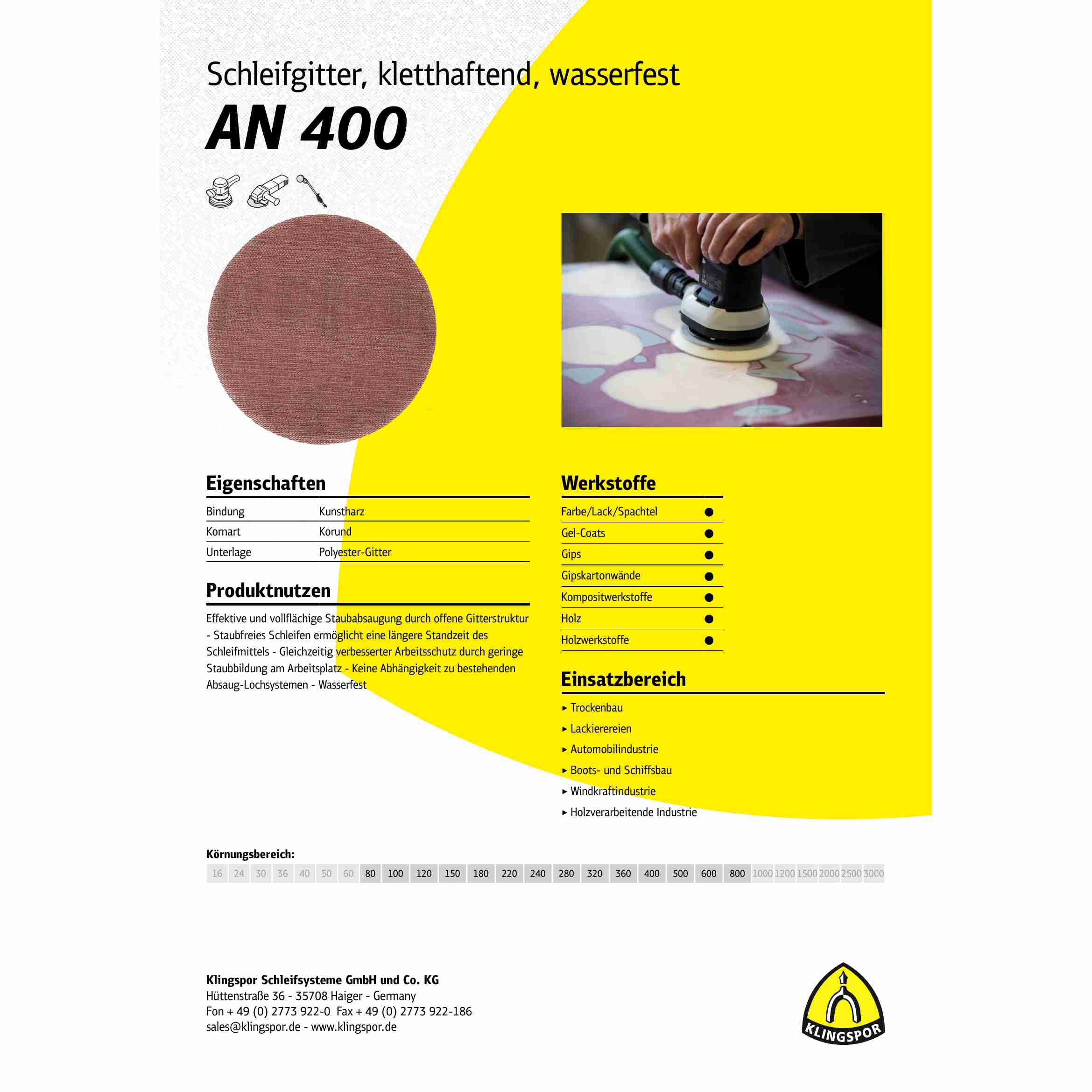 Eigenschaften: Die Klingspor AN 400 Gitterscheiben sind wasserfest, kletthaftend und von Industriequalität. Mit ihrer offenen Gitterstruktur bieten sie eine vollflächige Staubabsaugung, was ein nahezu staubfreies Arbeiten ermöglicht