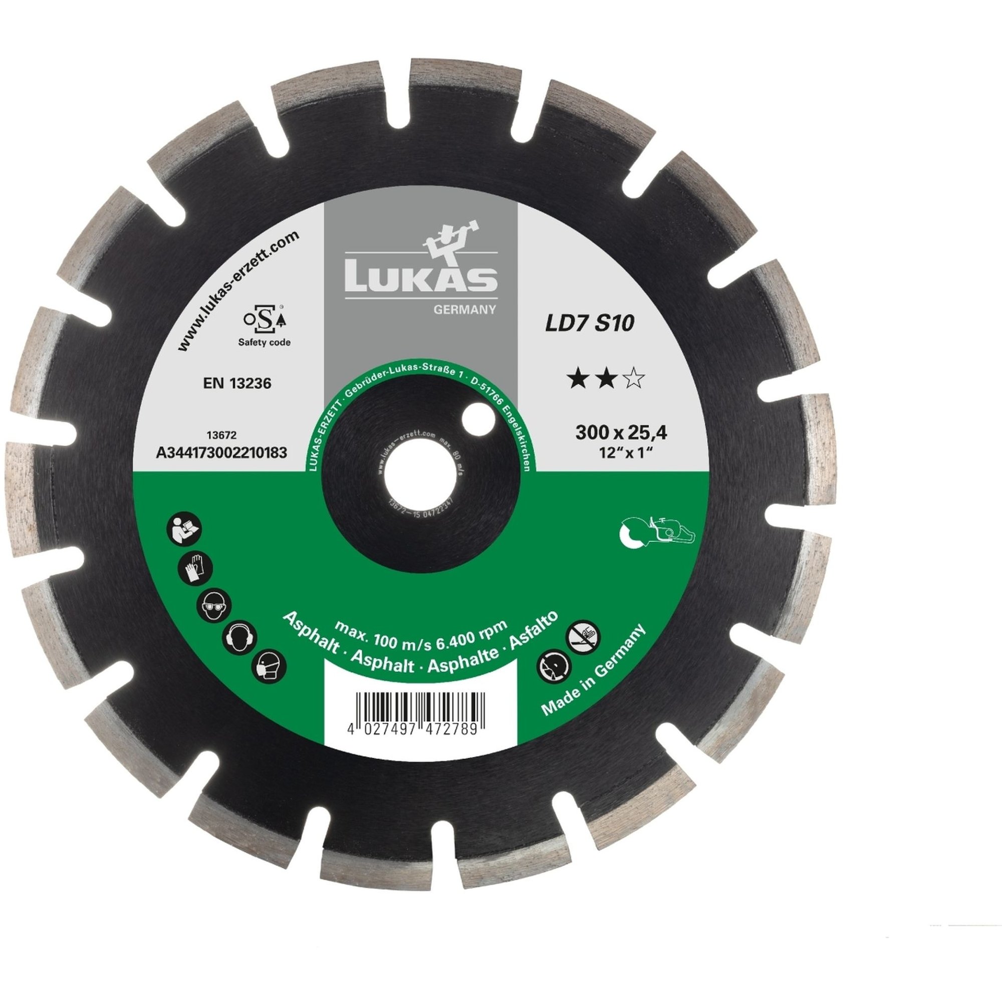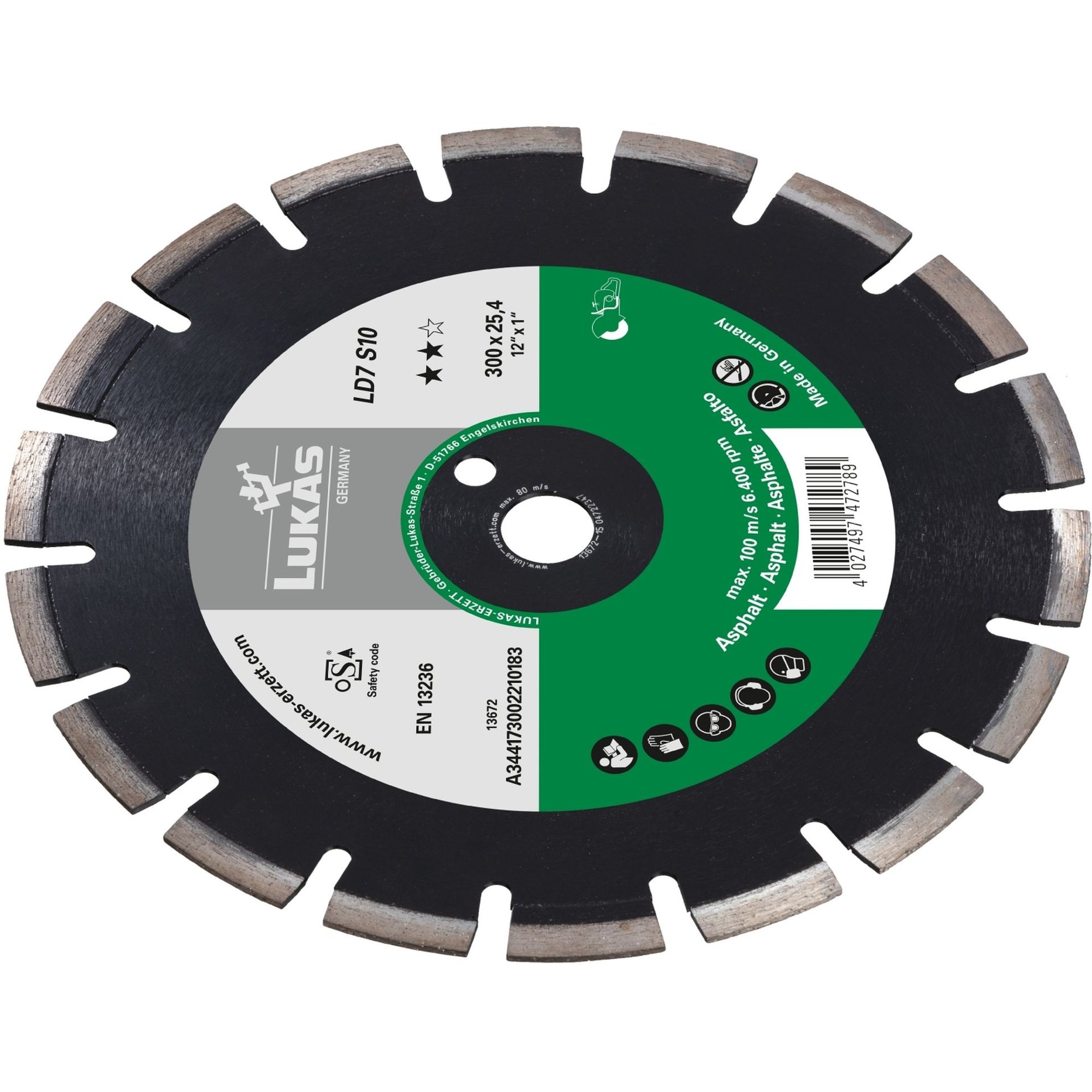 Die LUKAS Diamanttrennscheibe LD7 S10 für Asphalt ist speziell für den Einsatz mit Benzin-Trennschneidern entwickelt worden. Mit einem Durchmesser von 450mm ermöglicht sie das mühelose Trennen selbst der härtesten Materialien. Die Trennscheibe ist mit synthetischen Diamanten besetzt und mit einer neuartigen Legierung versehen, was eine hohe Arbeitsgeschwindigkeit und eine lange Lebensdauer gewährleistet.