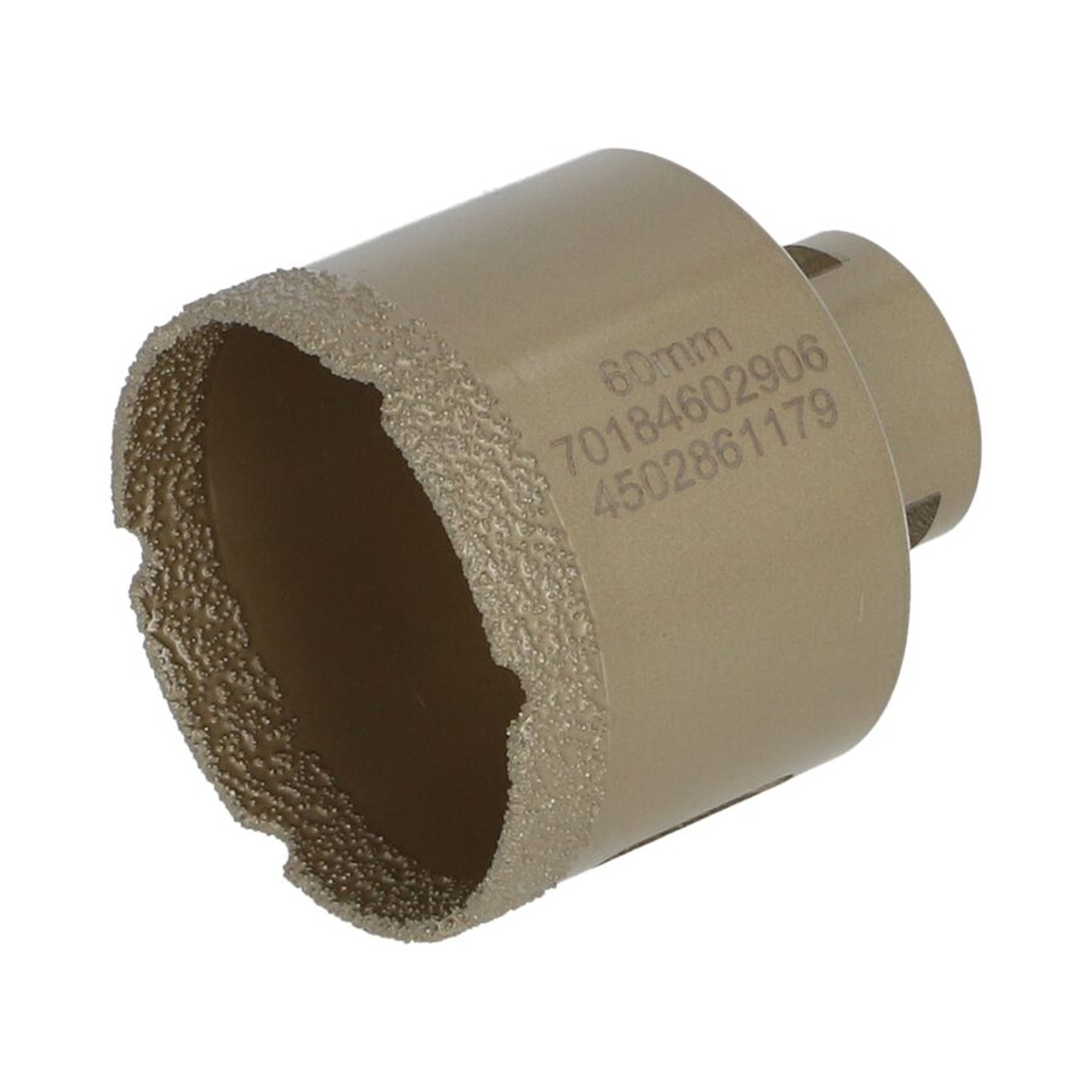 Vakuumgelötete Diamantbohrkrone für effizientes Trockenbohren von harten Keramikfliesen und Natursteinen. Einfache Montage auf Winkelschleifer dank M14-Anschluss.,