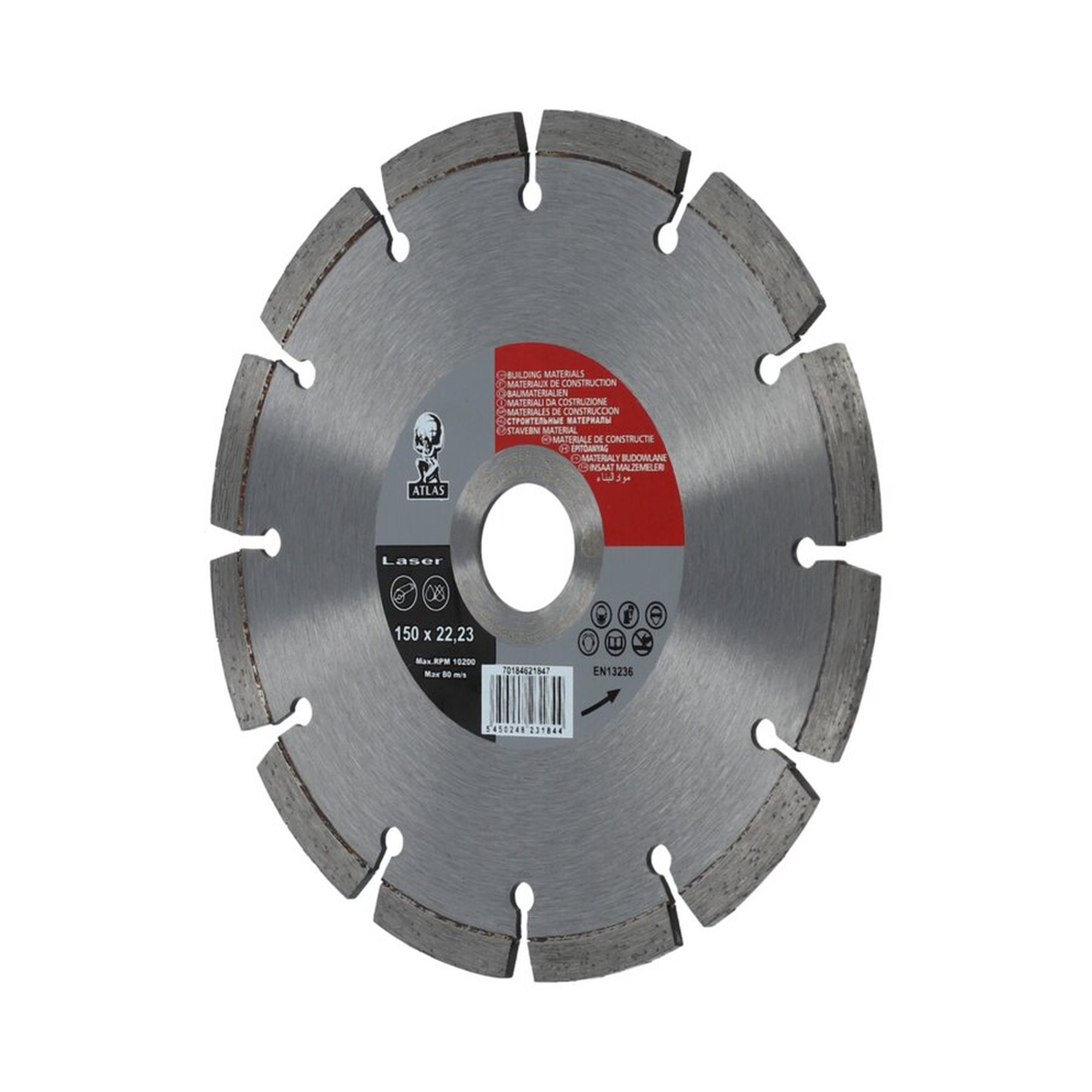 Die Diamantscheibe 150x22.23mm Atlas LASER ist speziell für den Einsatz im Baugewerbe und in Bohr- sowie Sägebetrieben entwickelt worden. Diese hochwertige Scheibe zeichnet sich durch ihre lasergeschweißte und lasersegmentierte Klinge aus, die für das effiziente Schneiden einer Vielzahl von Baumaterialien konzipiert ist.