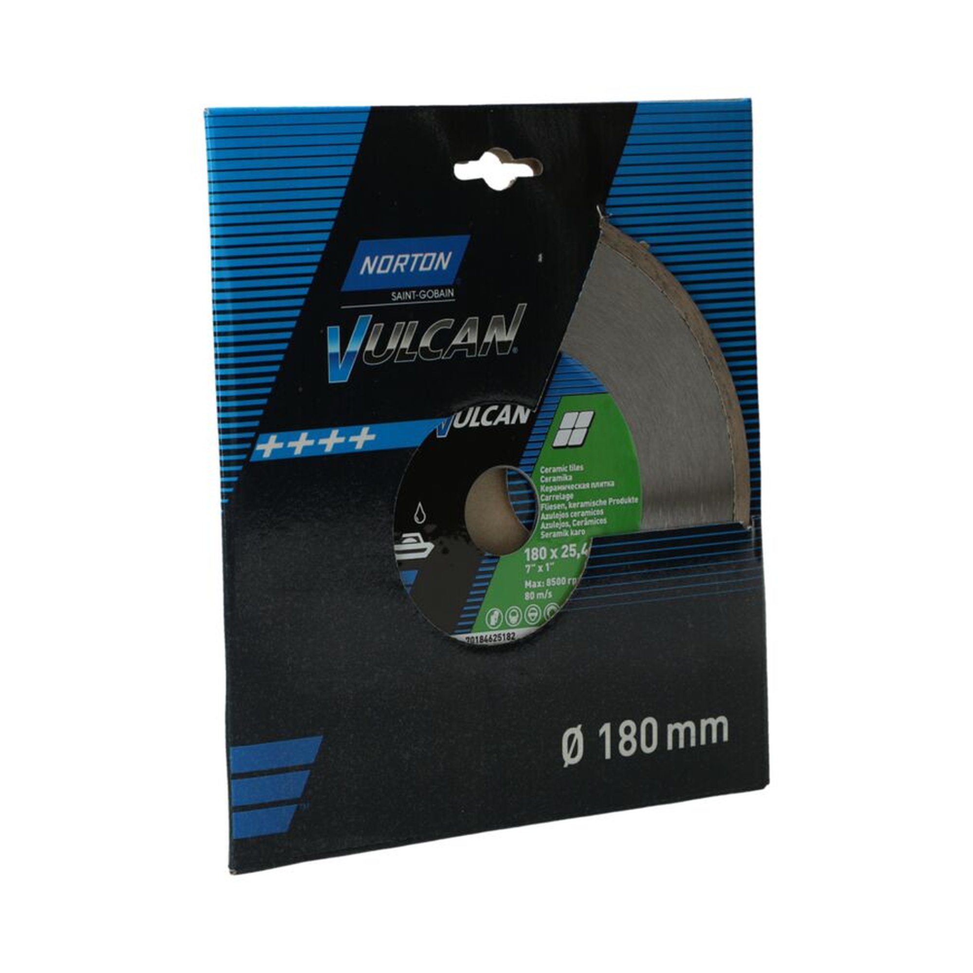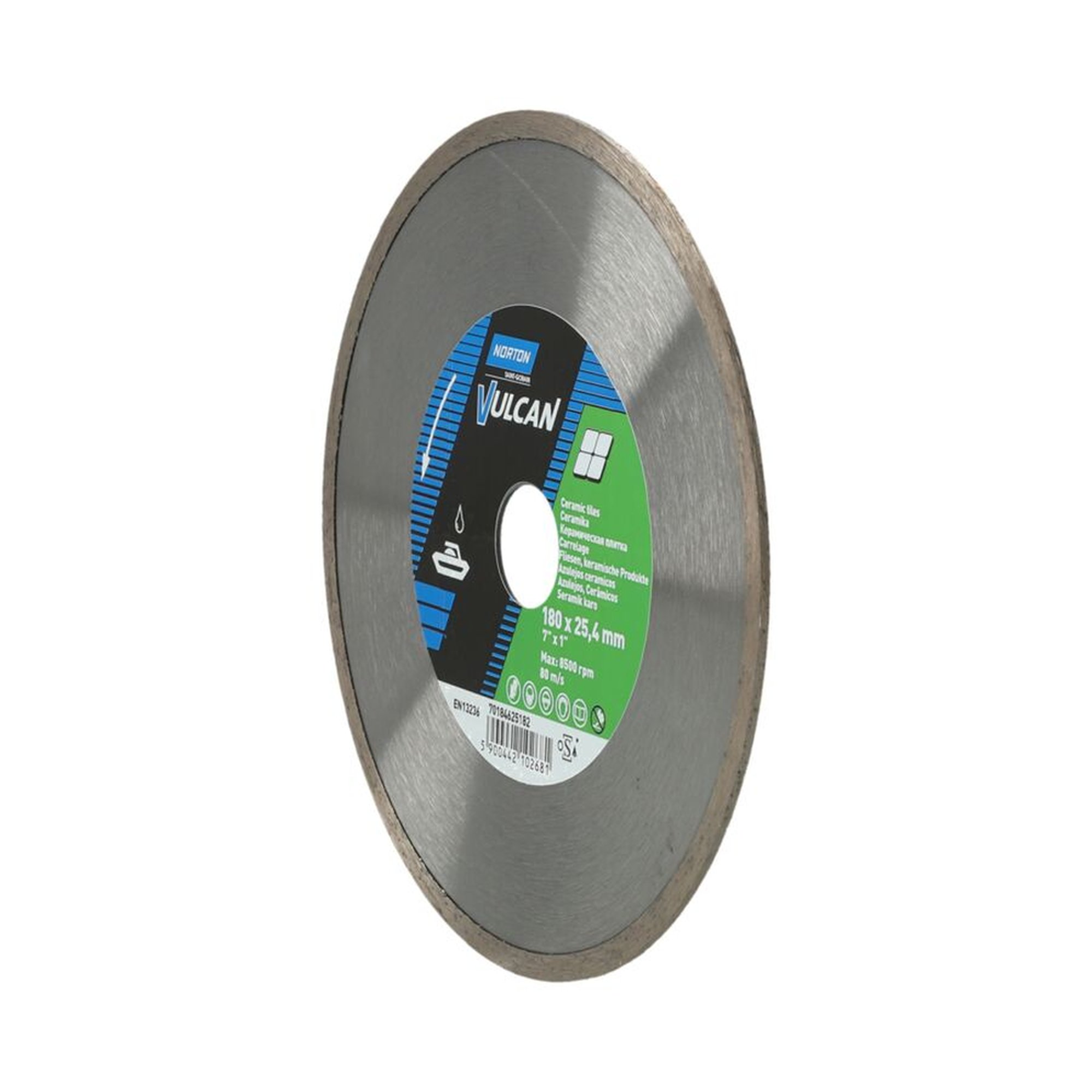 Die Norton Vulcan VULCAN TILE ist eine hochwertige Diamantscheibe der Dimension 180x25.4mm, die speziell für das Trennen von Keramikfliesen entwickelt wurde. Diese Scheibe zeichnet sich durch einen geschlossenen Rand aus, der eine saubere und präzise Schnittführung ermöglicht, was sie ideal für das Baugewerbe und insbesondere für Fliesenleger macht.